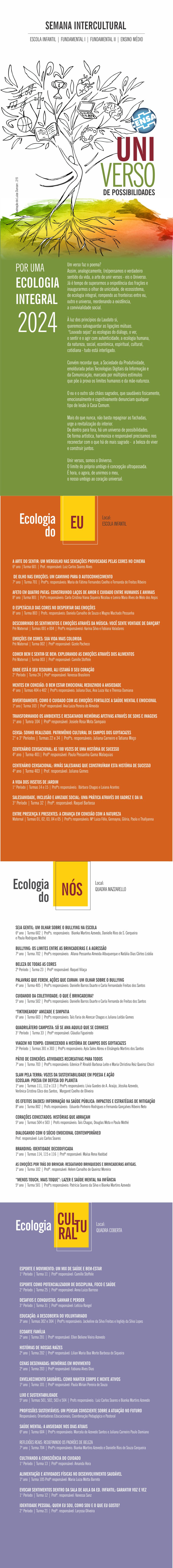 No sábado, foi a vez da Mostra Cultural. "UNIVerso de possibilidades: por uma ecologia integral" foi a culminância dos projetos desenvolvidos pelas turmas durante o ano. Baseados nas ecologias do EU (que trabalha as emoções individuais), do NÓS (que foca na interação com o outro) e CULTURAL (que engloba as ações/emoções com o mundo), os trabalhos abordaram os mais diversos temas (relação no site), encantando o público com a profundidade das reflexões. Apresentado com clareza pelos próprios alunos, foi possível ver a intensidade do trabalho que incluiu pesquisa, dinâmicas, debates, reflexões e busca de soluções.