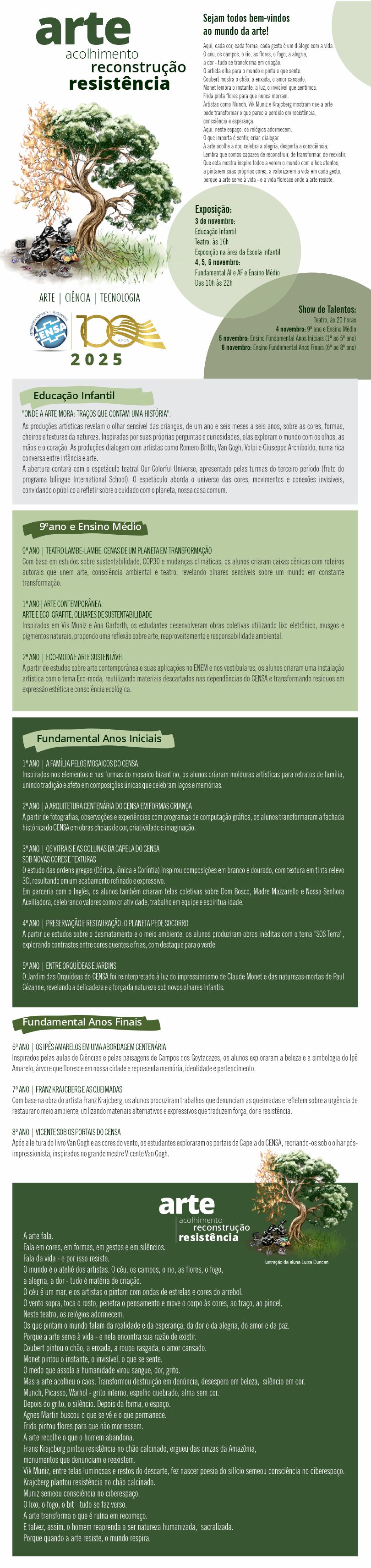 A Semana Intercultural 2025 do CENSA aconteceu entre os dias 3 e 6 de novembro. Repetindo o sucesso das edições anteriores, o evento foi um show de cultura, arte, ciência e tecnologia. Todos os segmentos participaram com trabalhos, criados a partir do tema "Arte: acolhimento, reconstrução e resistência". Telas, show de talentos e dramatização fizeram parte da programação, muito prestigiada e elogiada pelo público.