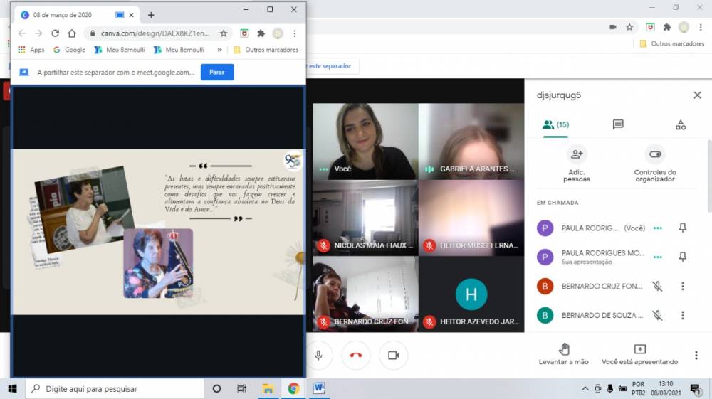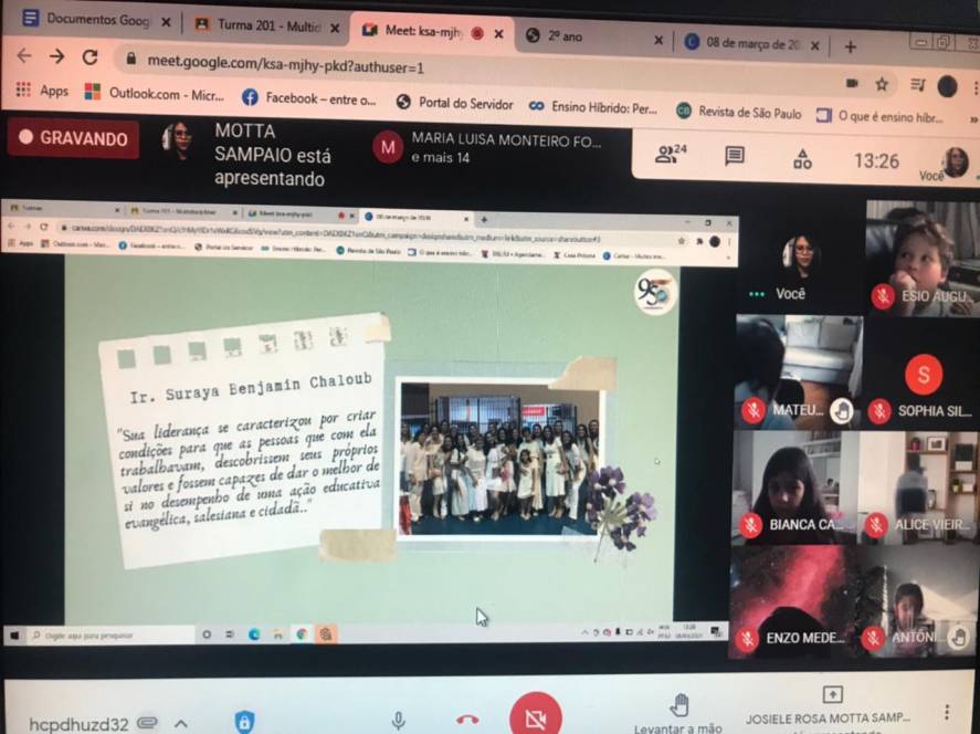 O Ensino Fundamental I do CENSA homenageou Ir. Suraya Chaloub, na acolhida de 8 de março, Dia Internacional da Mulher. Exemplo de ética, fé, humanidade, empreendedorismo, salesianidade e dedicação aos jovens, a diretora emérita do Auxiliadora deixou sua marca em gerações, durante todo o período em que dirigiu a escola. "Sua liderança se caracterizou por criar condições para que as pessoas descobrissem seus próprios valores e fossem capazes de dar o melhor de si. Ela será sempre um exemplo a ser seguido", disse Criscilamara das Neves, coordenadora do segmento.