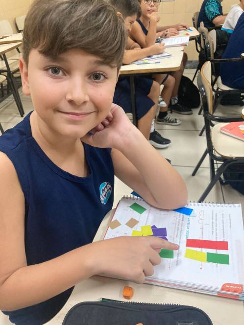 "Parou!" Com o objetivo de iniciar o conteúdo de frações equivalentes, o jogo animou as aulas do 5º ano fundamental, nos dias 22 e 26 de junho. Usando as fichas coloridas, disponíveis no material complementar da apostila didática,os alunos facilmente sistematizaram o conteúdo, fazendo a comparação entre as frações. A dinâmica consistiu em formar figuras do mesmo tamanho, partindo da ficha indicada pela professora, formando equivalências. Divertido e de rico aprendizado!