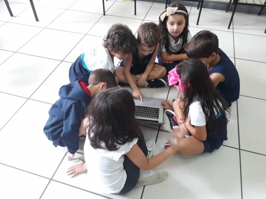 O 5º ano desenvolveu a Geometria a partir do Ensino Híbrido, abordagem que combina espaços, ferramentas e estilos de aprendizagem para potencializar o desenvolvimento de cada educando. Os alunos exploraram algumas propriedades dos sólidos geométricos, utilizando o software "Poly", recurso digital que permite o trabalho com os poliedros e suas respectivas planificações, a partir do movimento dos mesmos. Em seguida, construiram  esqueletos de poliedros, utilizando palitos, jujubas e massinha.