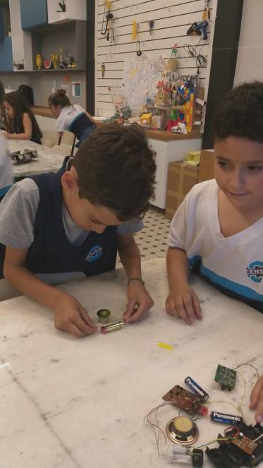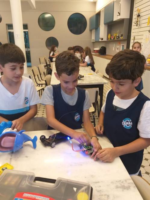 O 2º ano fundamental do CENSA participou de uma interessante aula prática na tarde de 10 de julho. Com brinquedos trazidos de casa, os alunos partiram para o Espaço Maker para descobrir como fazer transformações de energia. Experimentando, analisando e desmontando as principais peças, como motor, fios condutores, leds e engrenagem, a garotada chegou a dois tipos de transformação: de energia elétrica para energia de movimento de corpos (energia cinética) e energia cinética para energia elétrica. A partir daí, testaram e chegaram a criar pequenos circuitos.