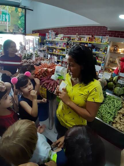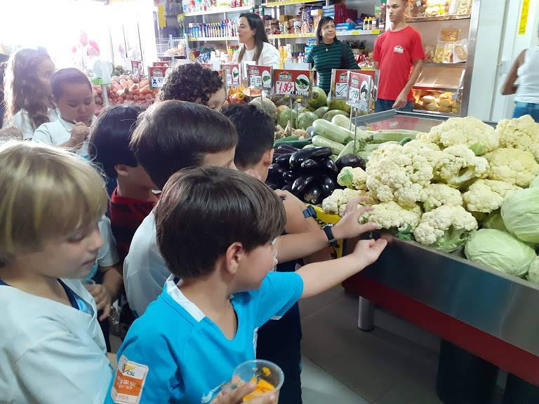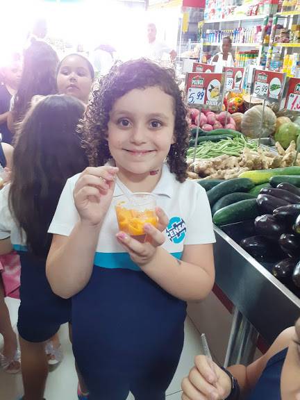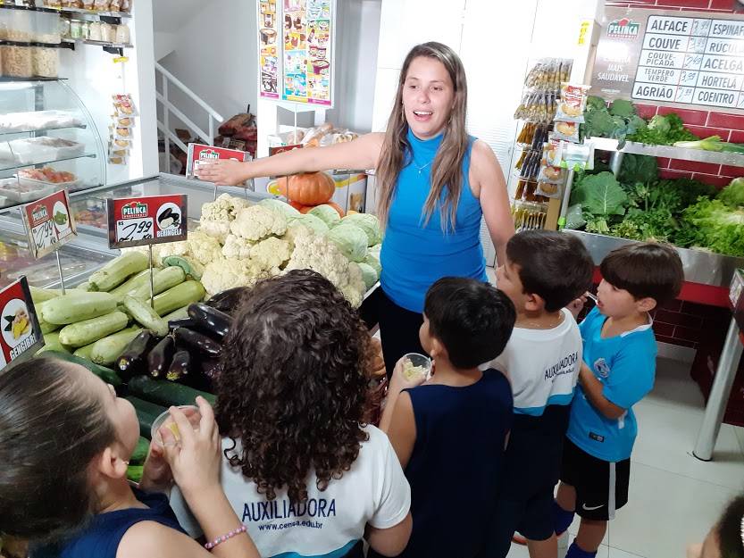A sala de aula do 1º ano fundamental do CENSA na tarde de 3 de outubro foi o Hortifruti! Desenvolvendo o projeto "Por uma vida mais saudável: medicamentos X alimentos", a visita foi uma aula de campo, que teve à frente a nutricionista Ana Paula explicando o valor dos alimentos e os benefícios de uma boa alimentação. A dinâmica também foi enriquecedora para o Programa Bilíngue, integrado ao projeto, uma vez que as crianças identificavam os alimentos em inglês, exercitando o vocabulário.