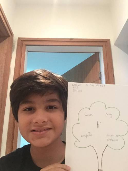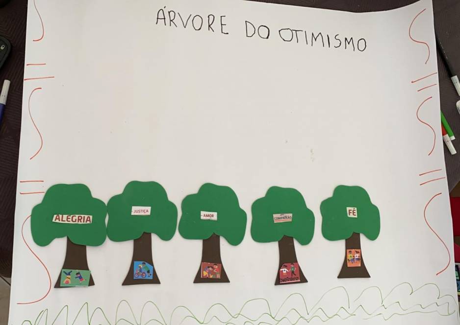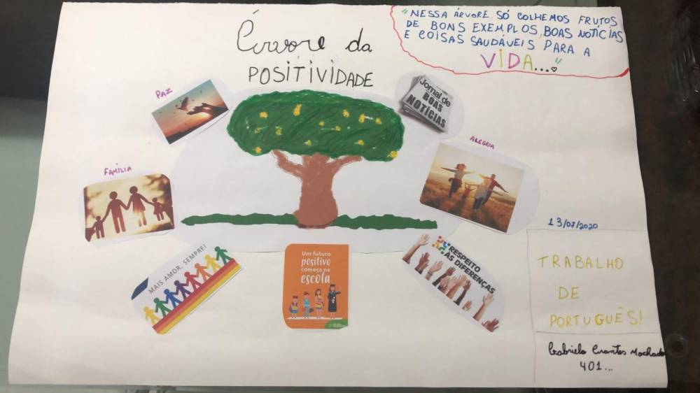 O 4º ano fundamental do CENSA construiu a "Árvore do Otimismo", no dia 29 de julho. A proposta surgiu na disciplina de Língua Portuguesa, com o objetivo de debater o contexto atual argumentando com base em fatos e informações confiáveis. Os alunos refletiram sobre os impactos da pandemia e as lições aprendidas nesse momento atípico da humanidade. A partir daí, montaram suas árvores colando gravuras ligadas a fatos alegres e engraçados no tronco e substituindo as flores e frutos por palavras otimistas.