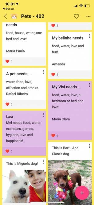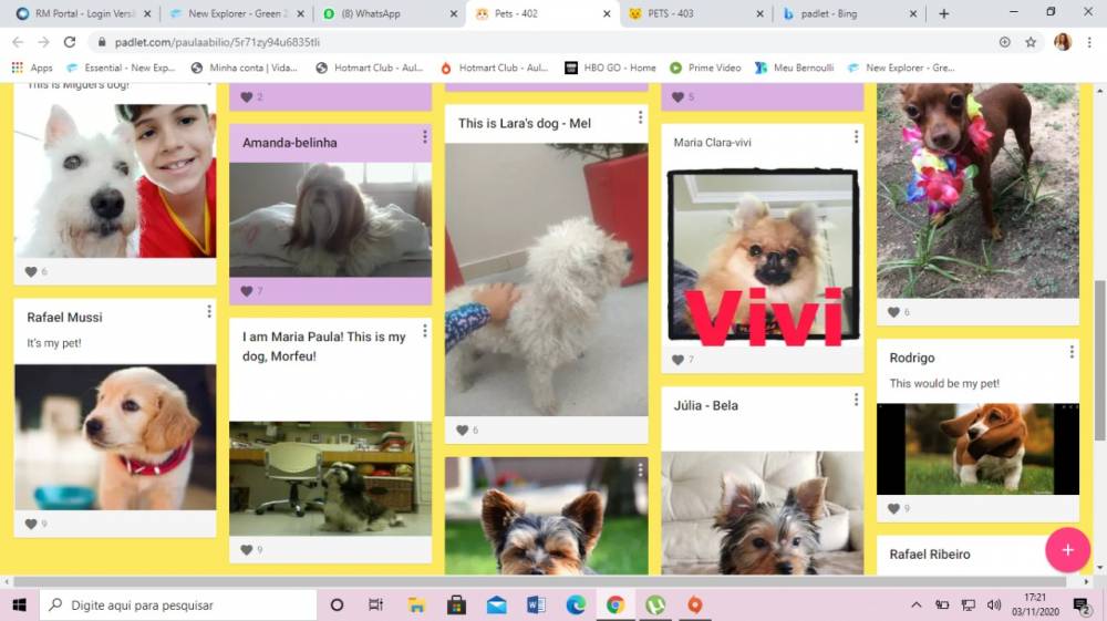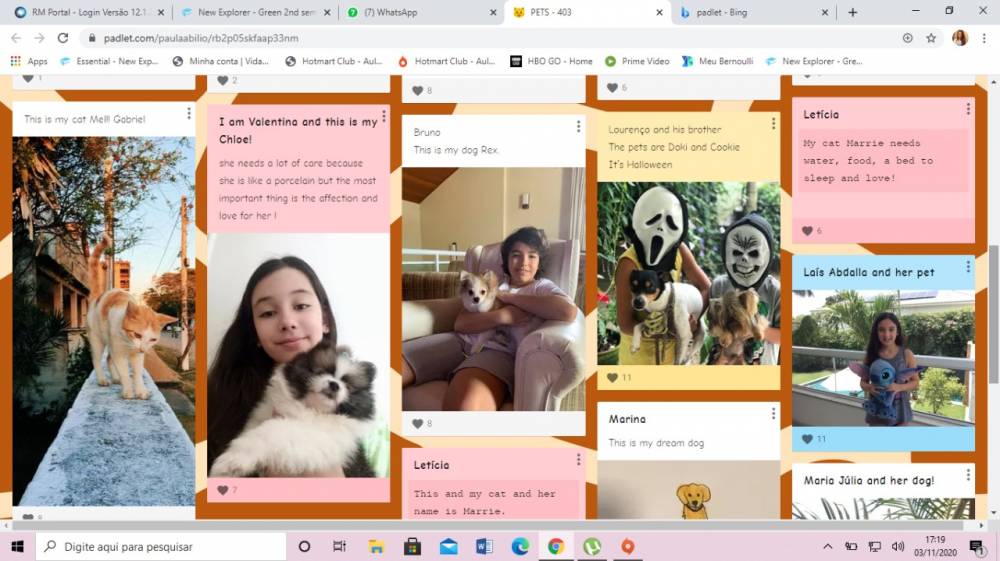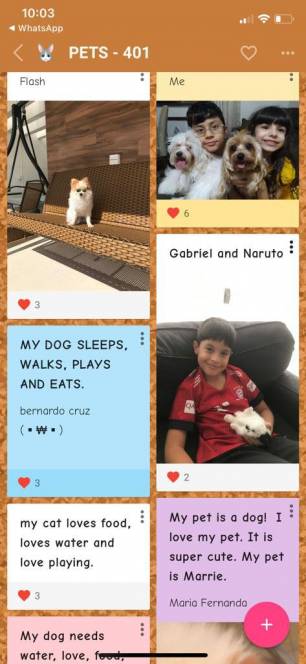 Estudando "Animal and us", nas aulas bilíngues, os alunos do 4º ano fundamental do CENSA não perderam a chance de apresentar seus bichinhos de estimação. Construindo vários padlets, a criançada mostrou fotos,falou das características de cada um e os cuidados diários necessários. "A interação foi tamanha que até aqueles que não tem pets usaram a imaginação e desenharam ou procuraram imagens para mostrar como desejariam que fossem", disse a teacher Paula Abílio.