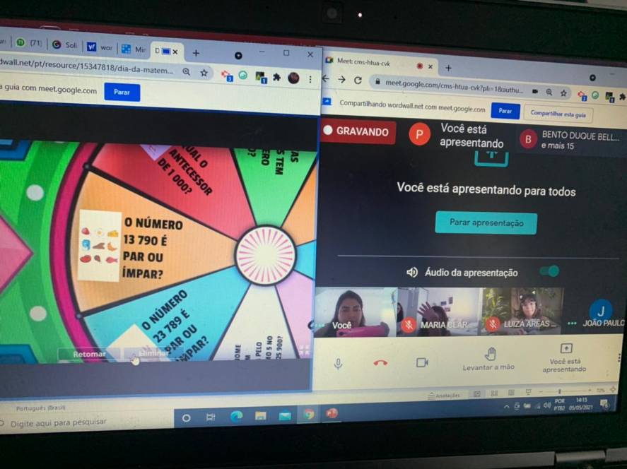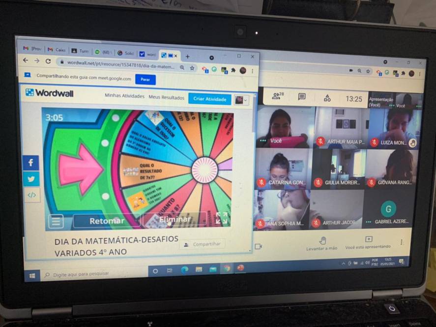 Já o 4º ano partiu para o “Desafio da Roleta”. Elaborado na plataforma WORDWALL, o jogo apresentava situações variadas envolvendo as habilidades matemáticas trabalhadas no 1o trimestre. A professora Paula Gama explicou que “foi possível revisar conteúdos de forma dinâmica”.