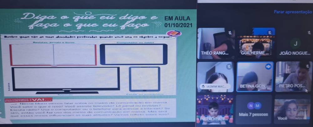 O livro "Eu no mundo", adotado pelo 3º ano fundamental do CENSA, foi o disparador de uma reflexão sobre o uso exacerbado dos aparelhos eletrônicos. Na sexta-feira, 1º de outubro, os alunos participaram de um debate sobre o tema, fazendo uma análise sobre o tempo gasto com televisão, celular, tablet e computador. "Como gosto de usá-los?", "Qual sua importância no meu cotidiano?", "Como seria a vida sem eles?" foram alguns questionamentos. "O objetivo foi mostrar às crianças o papel e o limite da tecnologia em suas vidas e valorizar o brincar, o estar e se fazer presente", explicou a coordenadora Criscilamara Neves.