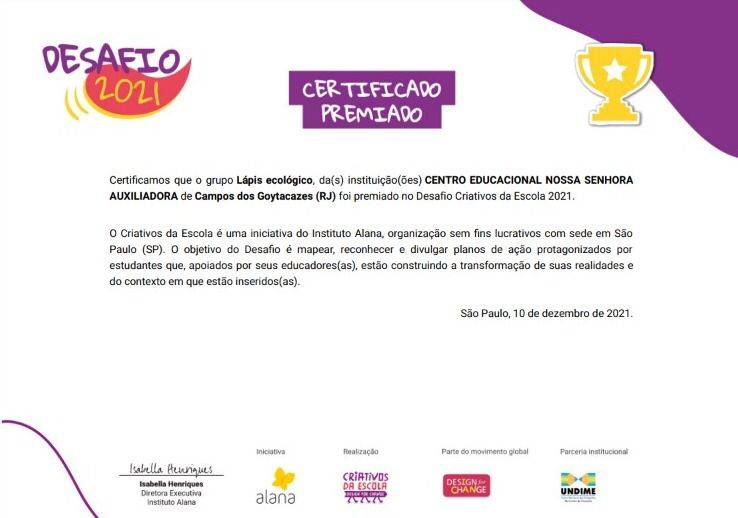 Após ganhar o prêmio internacional na Conferência Global Be the Change Celebration, na categoria Meio Ambiente em 2021, o projeto Lápis Ecológico, mais uma vez está em evidência. No dia 17 de março, a turma 501, autora do trabalho, recebeu oficialmente o título de "Alunos Embaixadores", do Programa Criativos da Escola. Na semana seguinte, 22 de março, foi a vez da professora Josiele Rosa Motta Sampaio tornar-se embaixadora do mesmo programa, que é desenvolvido pelo Instituto Alana, com sede em São Paulo.