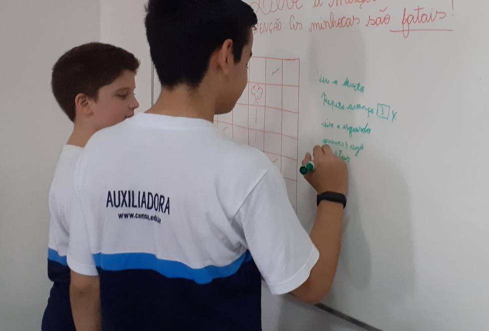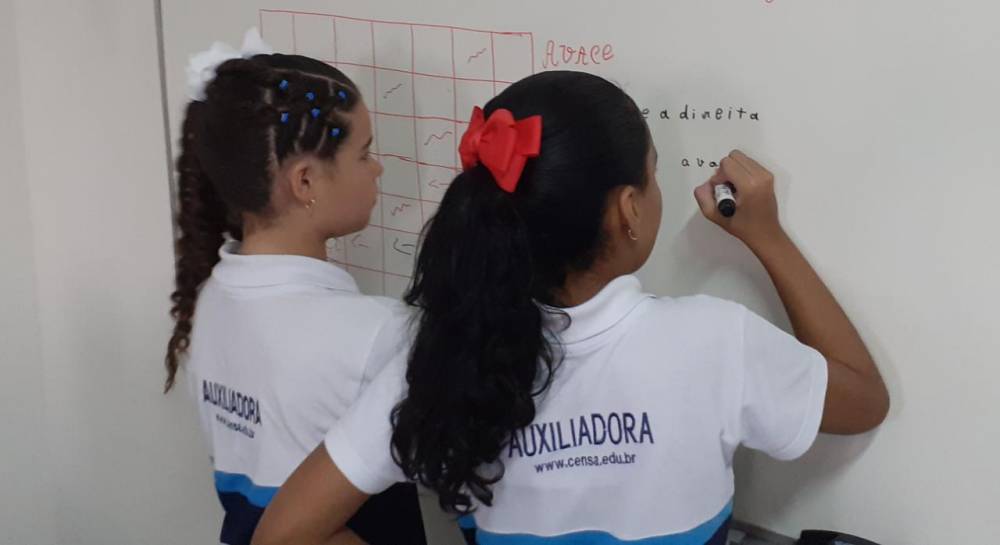 Mergulhado na iniciação à Robótica, o 5° ano fundamental do CENSA está na fase de cumprir os desafios de programação. A dinâmica tem inicio na lousa, com o desenvolvimento dos próprios jogos e, posteriormente, utiliza a plataforma CODE.ORG. "Essa prática estimula a intensa busca por soluções de problemas, o desenvolvimento cognitivo, o raciocínio lógico e o pensamento crítico", explica a coordenadora Criscilamara Neves.