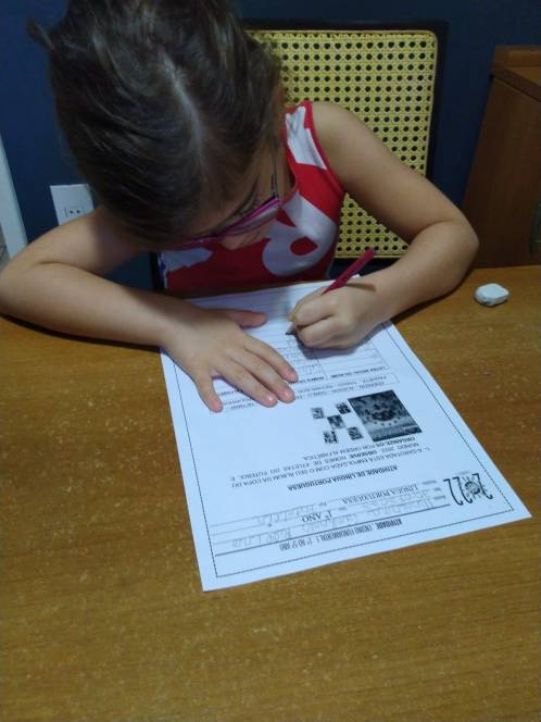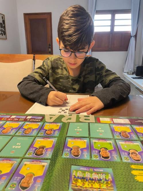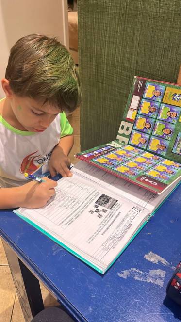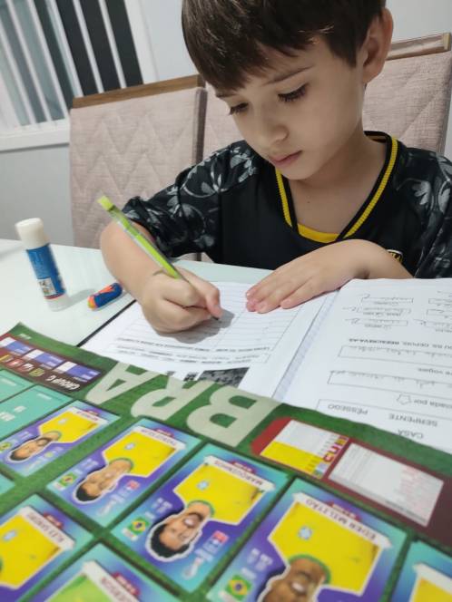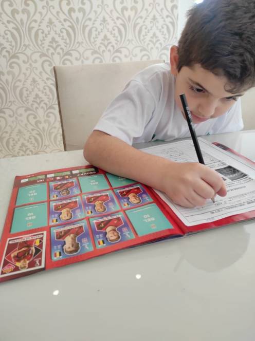 A disciplina de Língua Portuguesa aproveitou a atual paixão da criançada para uma atividade em sala de aula. Na segunda-feira (20/09) o 1º ano fundamental teve como objetivo colocar em ordem alfabética os nomes dos atletas da seleção brasileira de futebol. Empolgados, alguns alunos pesquisaram em seus álbuns de figurinhas da Copa do Mundo, tornando o aprendizado mais divertido e motivador. "Foi uma atividade muito legal e até peguei o meu álbum de figurinhas para ler os nomes de todos os jogadores", disse Gabriel Pinheiro Borges, da turma 101.