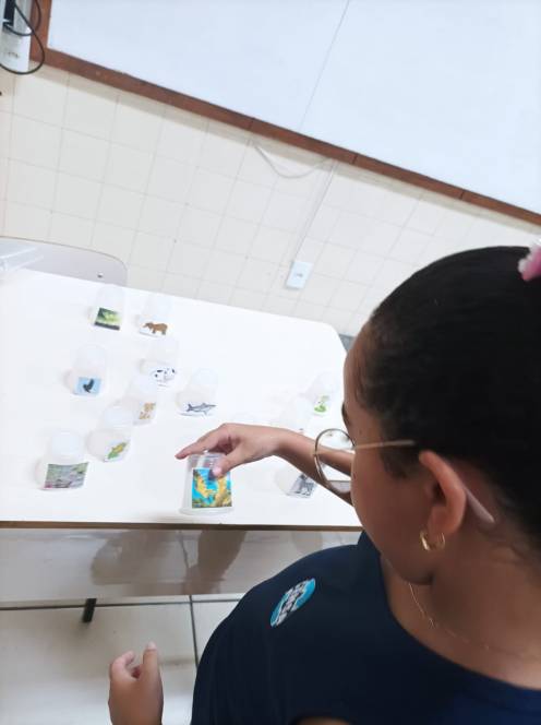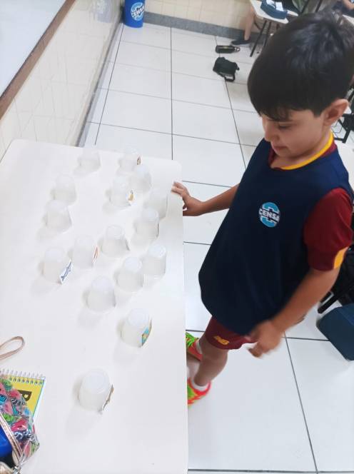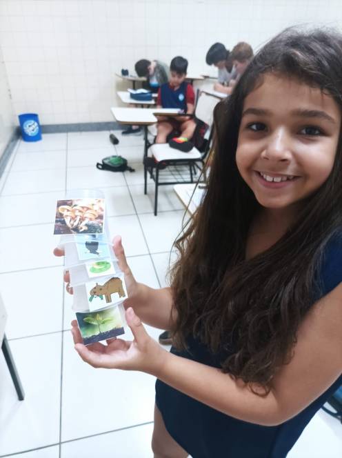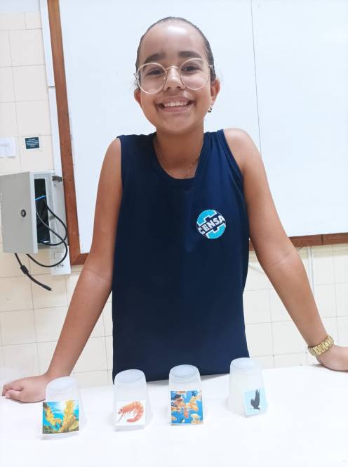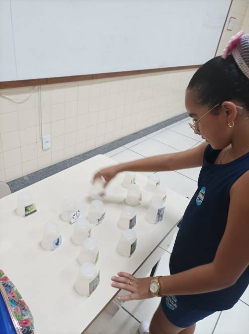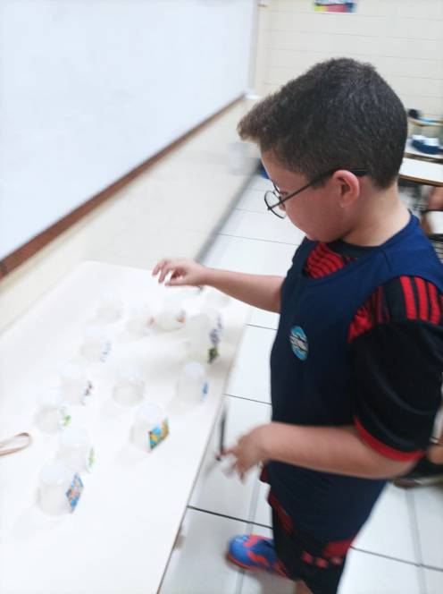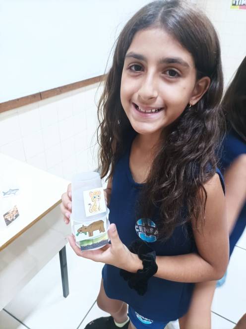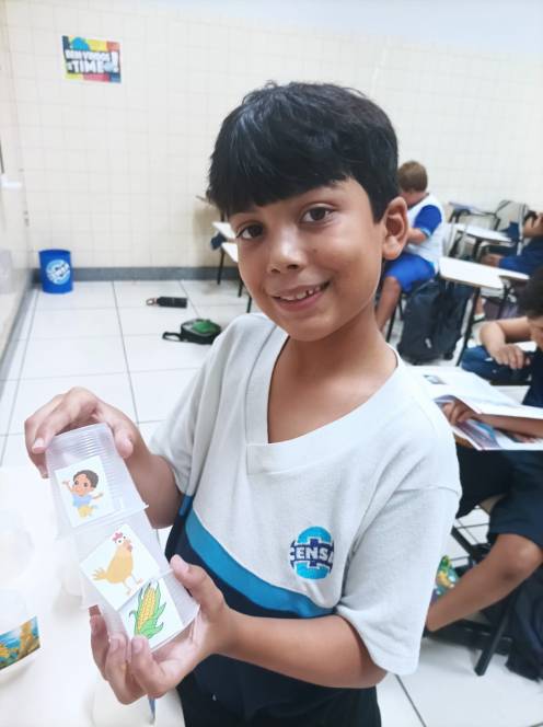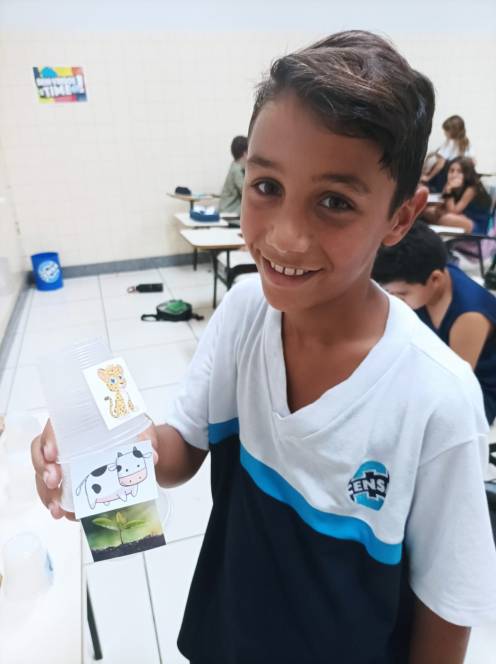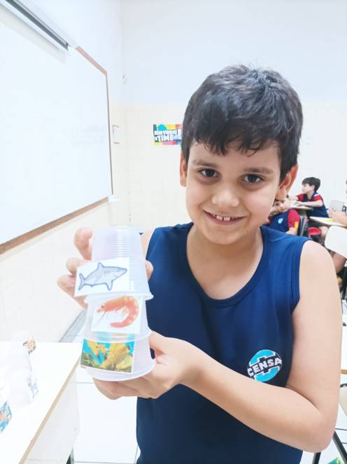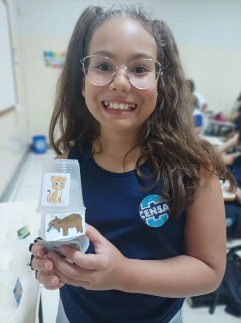 Estudando cadeia alimentar, o 4º ano fundamental do CENSA participou de uma prática para sistematizar o conteúdo, na tarde de 9 de março. Usando copos descartáveis, os alunos colocaram um "ser vivo" dentro do outro, observando a dependência entre eles no processo de obtenção de energia. A dinâmica permitiu construir e analisar cadeias alimentares simples, reconhecendo a posição de produtor, consumidor e decompositor ocupada pelos seres vivos e o papel do sol como fonte primária de energia na produção de alimentos.