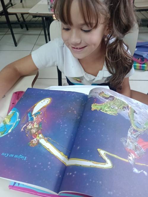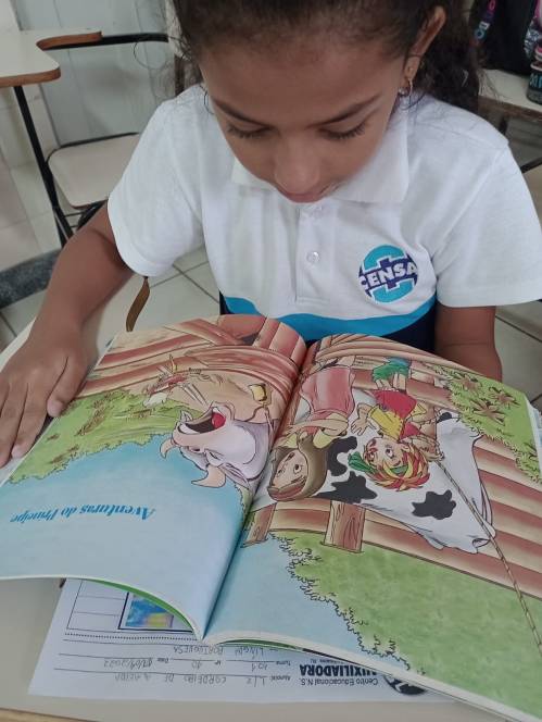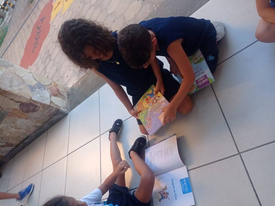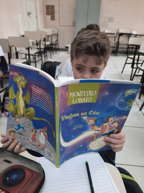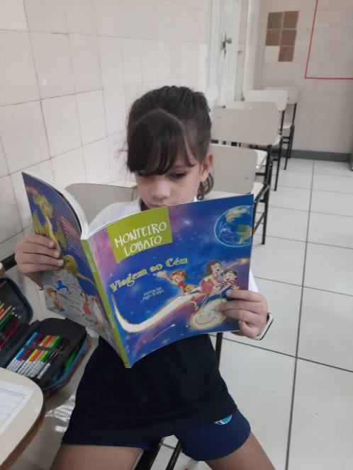A criançada se encantou com os personagens do Sítio do Picapau Amarelo e folheou algumas coleções de Monteiro Lobato. "Viagem ao céu" foi a escolhida para a leitura coletiva e posterior reescrita, na aula de Produção Textual. Segundo a professora Josiele Sampaio, "trabalhar a reescrita ativa a memória e permite olhar a história por vários ângulos, uma vez que cada criança enfatiza e acrescenta ali um pouco da sua identidade poética."