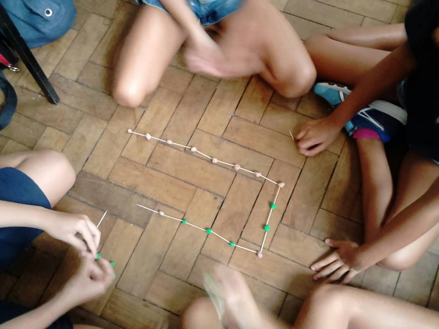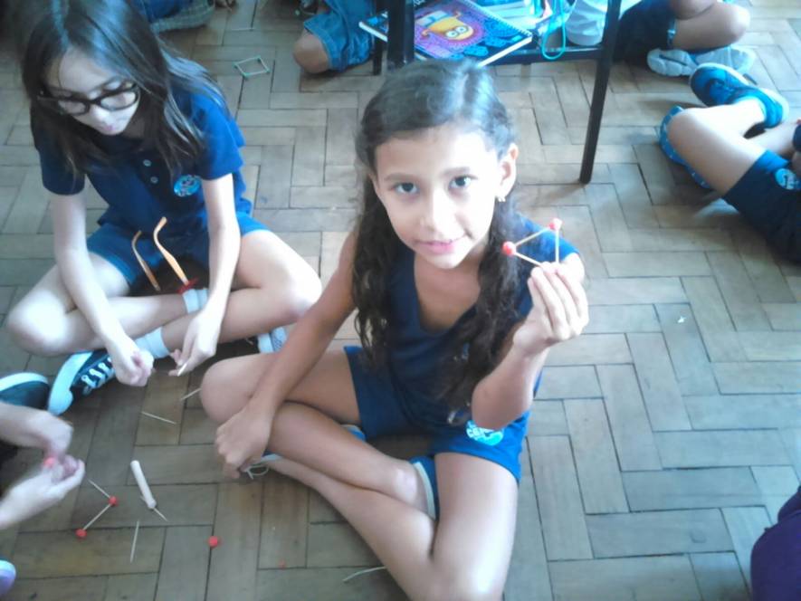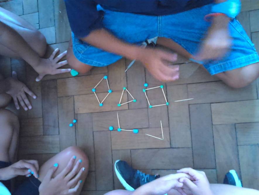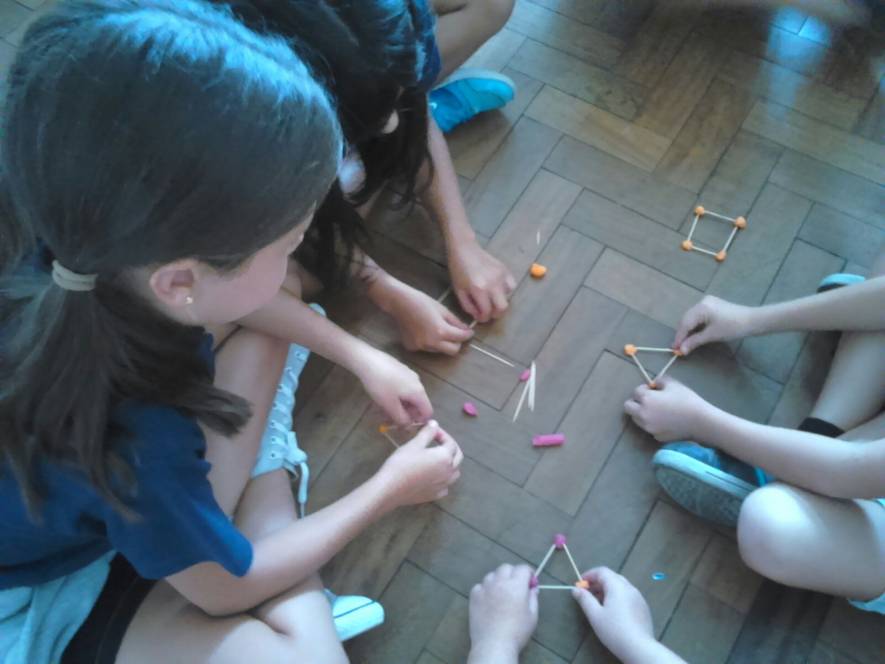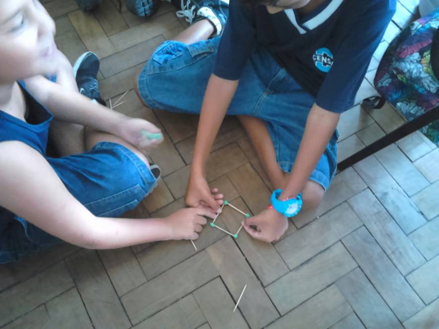 Os alunos do 3º ano trabalharam as formas geométricas com palitos e massa de modelar. Construiram triângulos e quadriláteros, explorando seus lados e vértices.