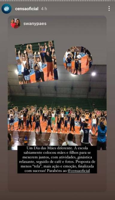 O Fundamental I do CENSA, 1º ao 5º ano, comemorou o Dia das Mães retribuindo o mesmo cuidado carinhoso que elas têm com os filhos. Em dois encontros, nos dias 9 e 10 de maio, os alunos receberam as mamães com a mensagem "Mãe: autocuidado e amor. Te ver bem me faz bem!". "Nossa intenção foi lembrar às mães que é preciso reservar um tempo para elas, do olhar para si", explicou Criscilamara Neves, coordenadora do segmento. Com a parceria da academia ISEFit e da equipe de esportes do CENSA, as tardes foram de relaxamento, diversão e atividade física em conjunto com os filhos.