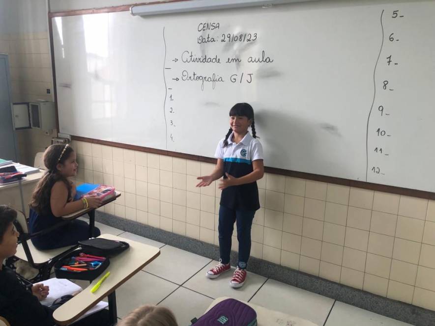 Que tal um ditado através da mímica? Foi dessa forma que o 3º ano fundamental do CENSA exercitou a ortografia de palavras com G e J. A regra era adivinhar a palavra através dos gestos do colega e, depois, registrá-la corretamente no caderno. Uma atividade divertida e de grande aprendizado! A dinâmica aconteceu na aula de Língua Portuguesa, de sexta-feira, 28/08.