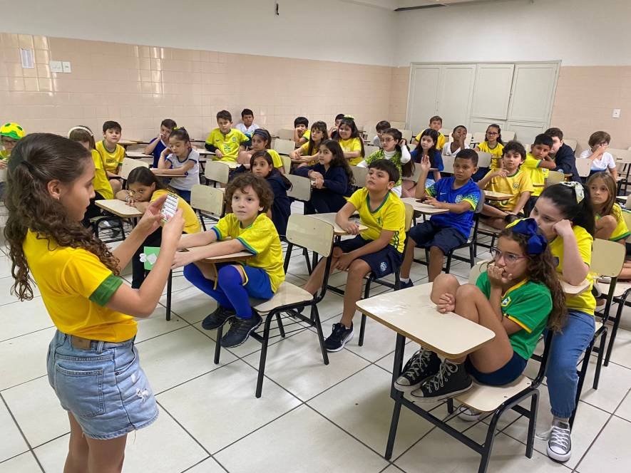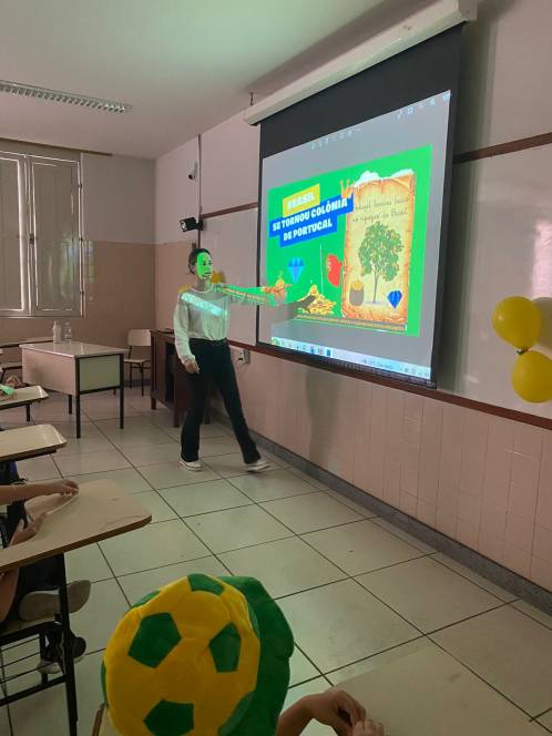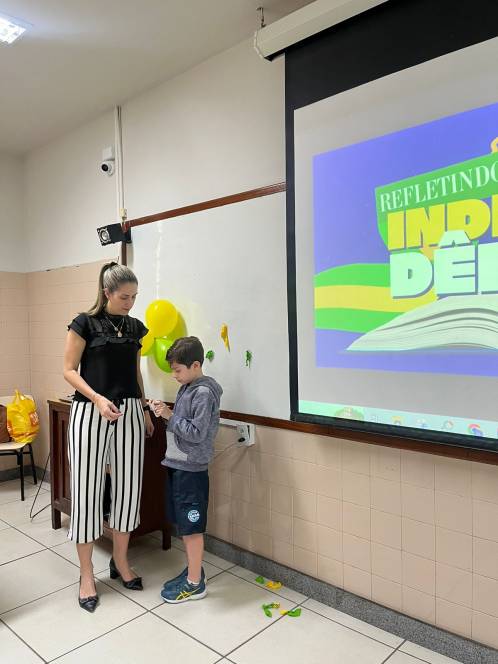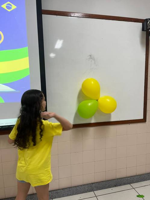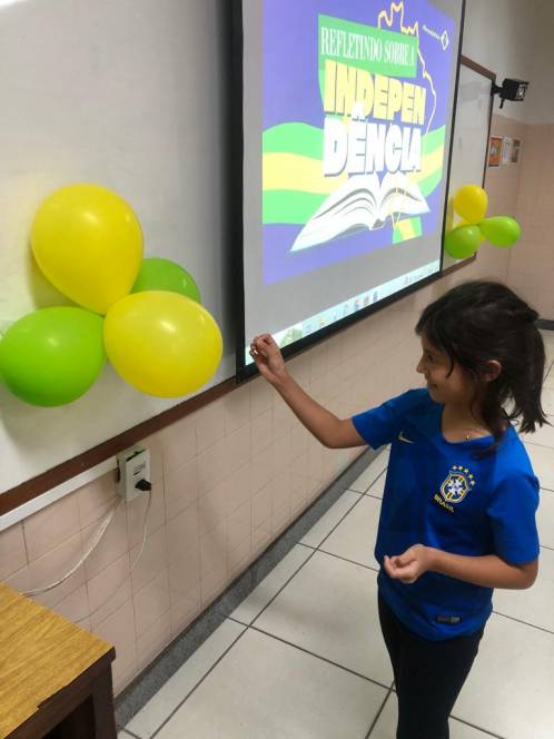 A Independência do Brasil foi tema de muitas aulas na primeira semana do mês de setembro. O 3º ano fundamental participou do Aulão da Independência, na segunda-feira, 4/09, estudando sobre a descoberta, a origem, a formação do povo brasileiro e o significado do hino nacional. Para conferir o conteúdo, nada melhor que um divertido jogo: o "Estouro da Independência"! Era estourar o balão e responder a pergunta. O resultado? Muito aprendizado e diversão!