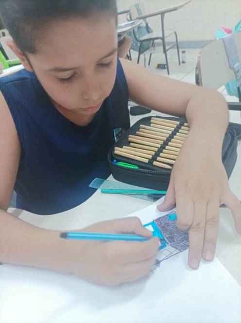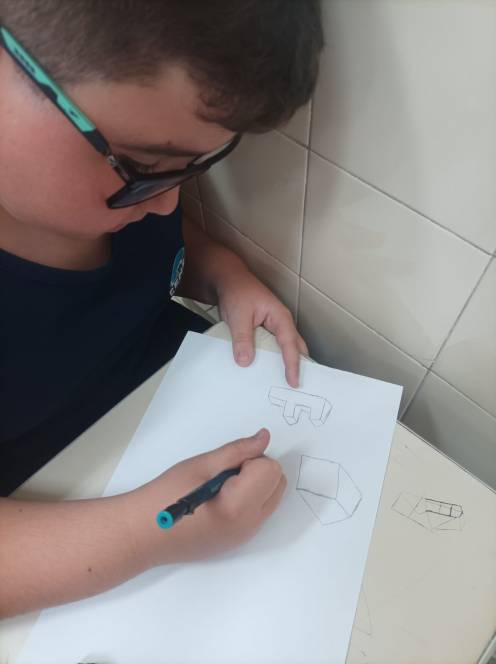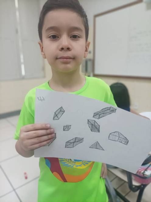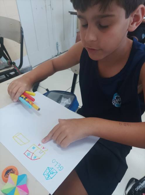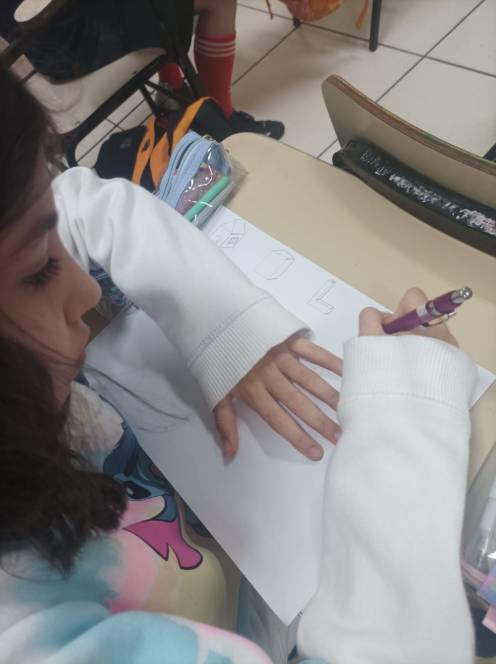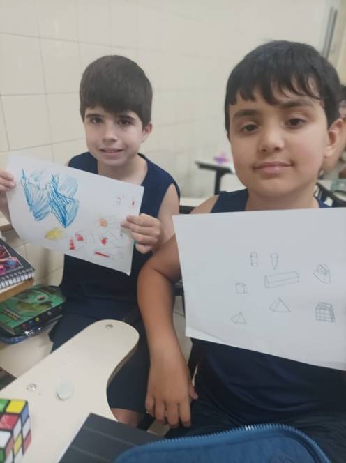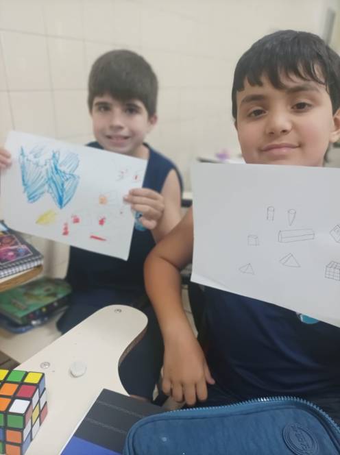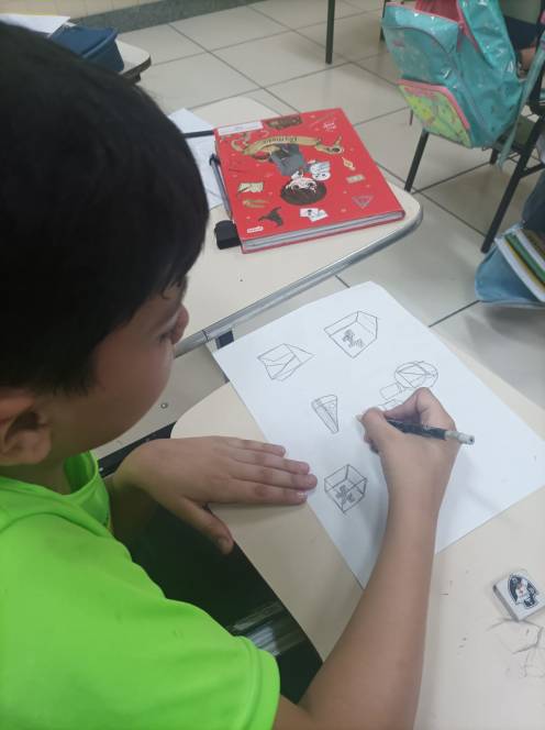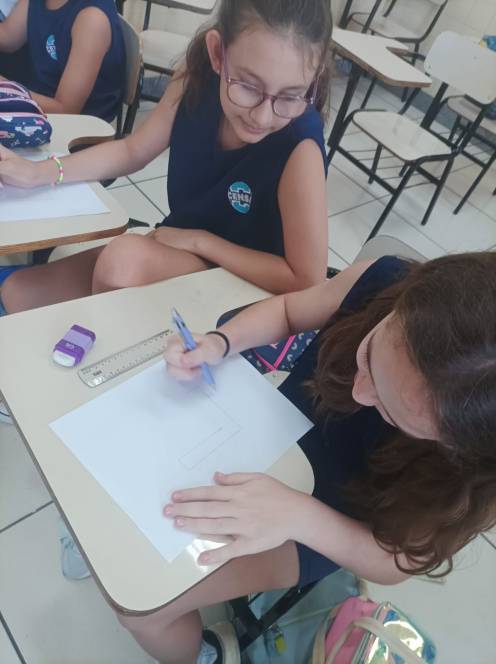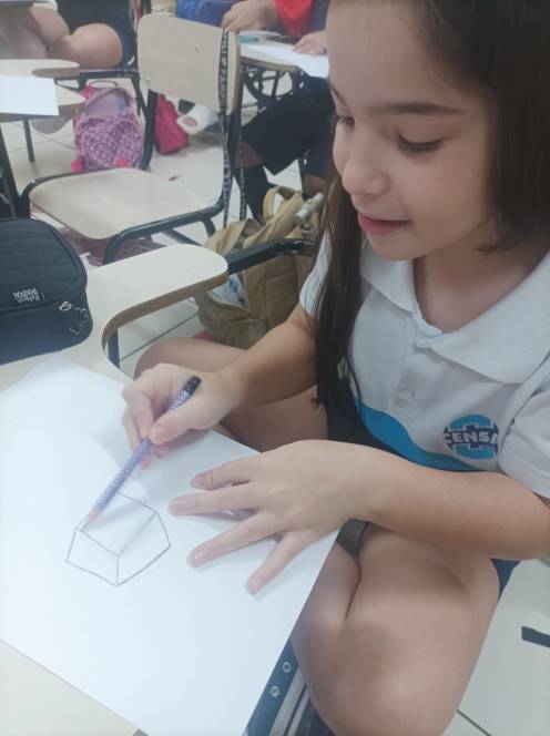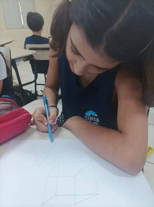 Prestes a iniciar a produção de desenhos em 3D no computador, o 4º ano fundamental do CENSA começou com uma prática no papel. Nas aulas de 12 e 18 de setembro, os alunos construiram e desenharam objetos 3D à mão, com objetivo de trabalhar noções de dimensão e proporção. O próximo passo será no computador, através de aplicativos. "Foi um momento de desafio e aprendizado, habilidades importantes para o pensamento computacional", disse a professora Bianka.