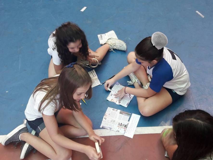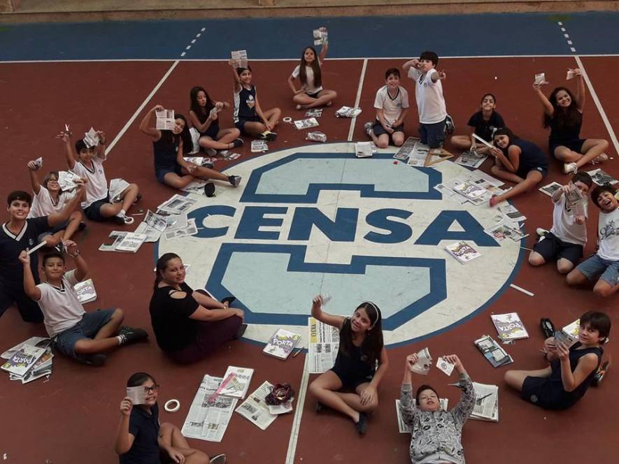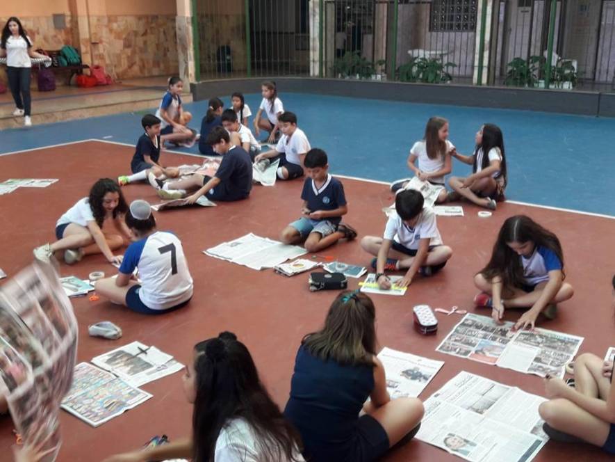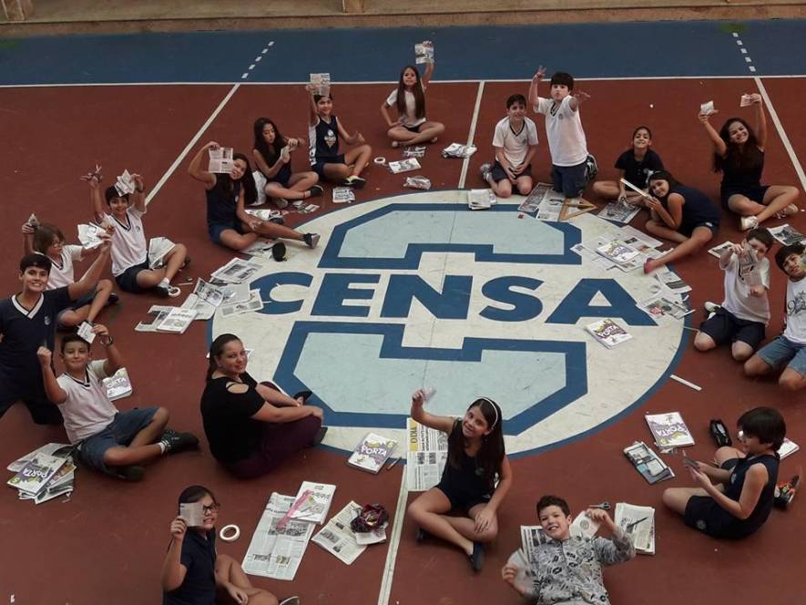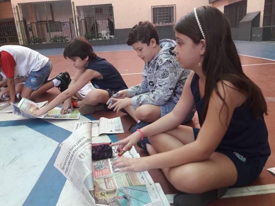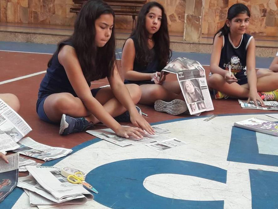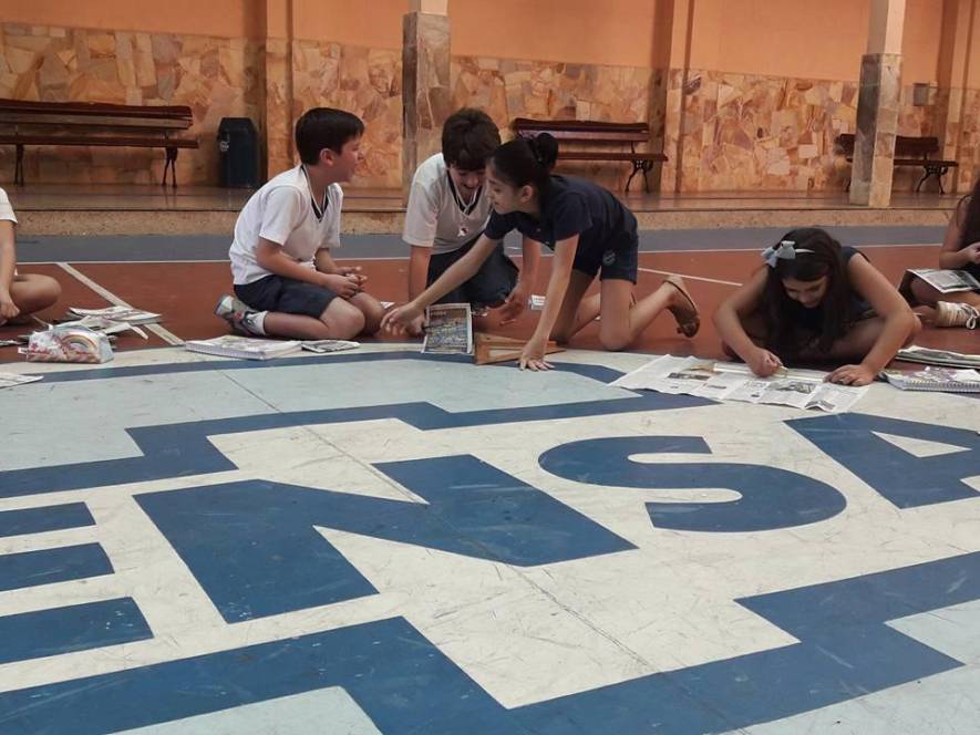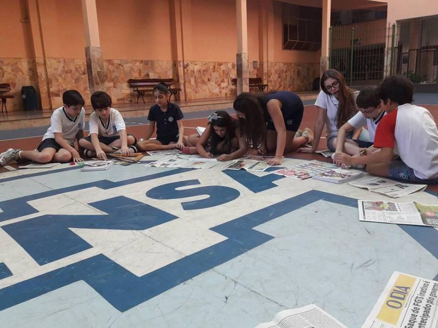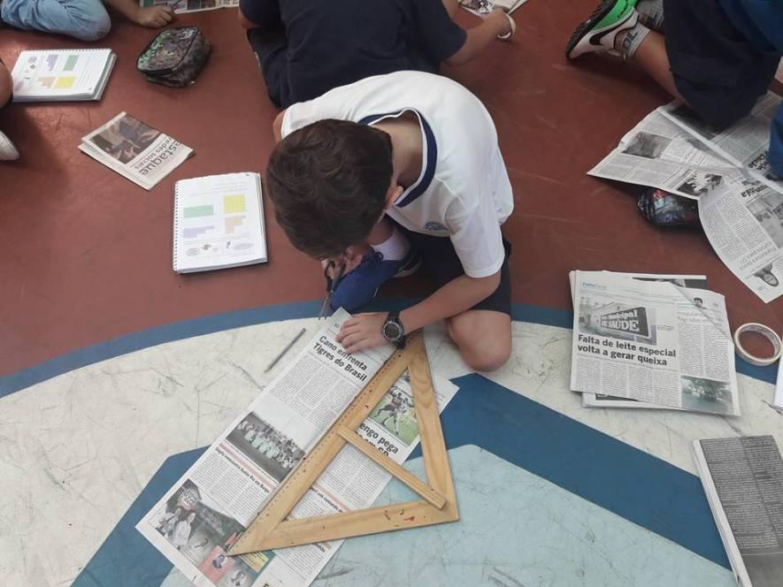 No dia 8 de agosto, com jornal, trena e fita crepe, as turmas do 5º ano, auxiliados pela professora Marcela Santos, construíram o metro quadrado em tamanho real e distinguiram as medidas de comprimento das medidas de superfície. As investigações não pararam por aí. A professora propôs a decomposição do quadrado em três triângulos. Ao analisar diferentes figuras com a mesma área, a garotada pode estabelecer a diferença entre perímetro e área.
