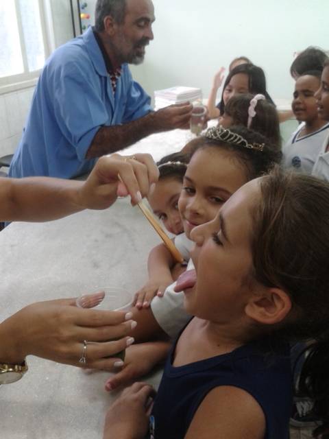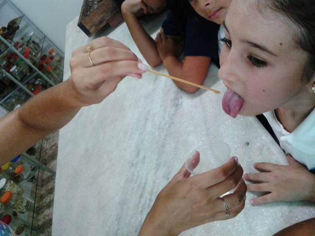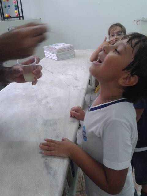 Em cada potinho foi colocado um tipo de líquido com os sabores: azedo, amargo, doce e salgado. Todas as crianças experimentaram e identificaram os quatro sabores.