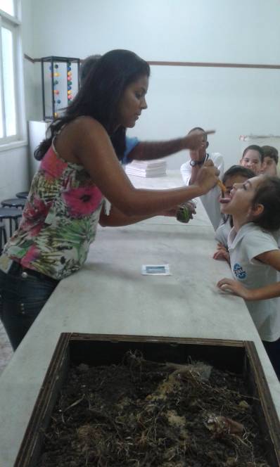 Alunos do 2º ano no Laboratório de Ciências explorando o sentido do paladar: doce, azedo, amargo e salgado.