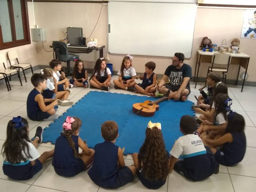 Grande motivadoras, as aulas de música e as atividades na biblioteca possibilitam a exploração da imaginação e promovem o desenvolvimento da criatividade, favorecendo o desenvolvimento cognitivo e linguístico das crianças. No Auxiliadora, essas práticas são constantes e grandes aliadas no aprendizado do 1º ano fundamental. De maneira descontraída e lúdica, os alunos desenvolvem a acuidade auditiva, a memória e hábitos de leitura integrados, promovendo um processo de alfabetização e letramento através da experimentação de diferentes linguagens.