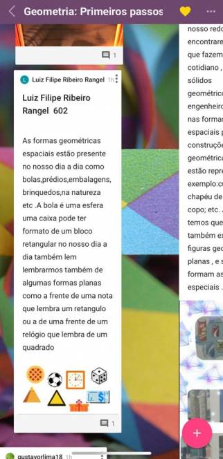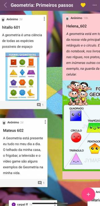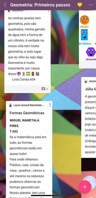 O 6º ano fundamental do CENSA utilizou o aplicativo Padlet para expor, no dia 27 de maio, os conhecimentos geométricos adquiridos sobre ponto, reta e plano. O objetivo foi estabelecer relações entre figuras planas e suas representações, envolvendo a observação sob diferentes pontos de vista, construindo e interpretando. "A atividade auxilia a compreensão da ideia intuitiva de ponto, reta e plano, valorizando o uso de atividades práticas e de investigação com materiais didáticos físicos e virtuais de matemática num processo de ensino aprendizagem ativo e divertido", disse a professora Marcela Santos.