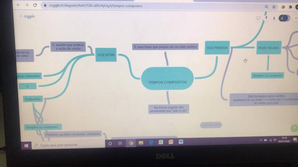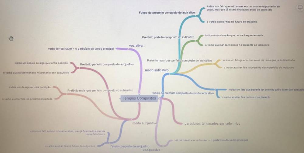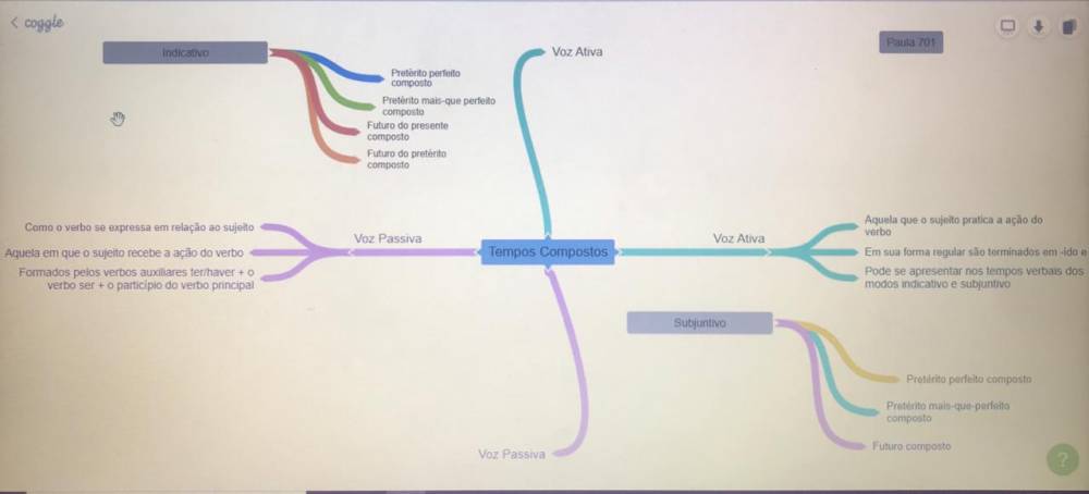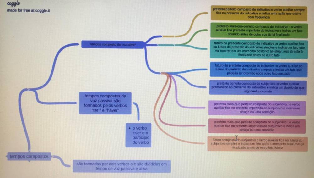 O 7º ano fundamental do CENSA utilizou a ferramenta colaborativa de criação de mapa mental Coggle do Google, na aula de Língua Portuguesa de 9 de julho. O objetivo foi a elaboração de um trabalho contendo os tempos compostos, organizando o conteúdo estudado e simulando o fichamento, gênero já utilizado desde 2019, pelos alunos.