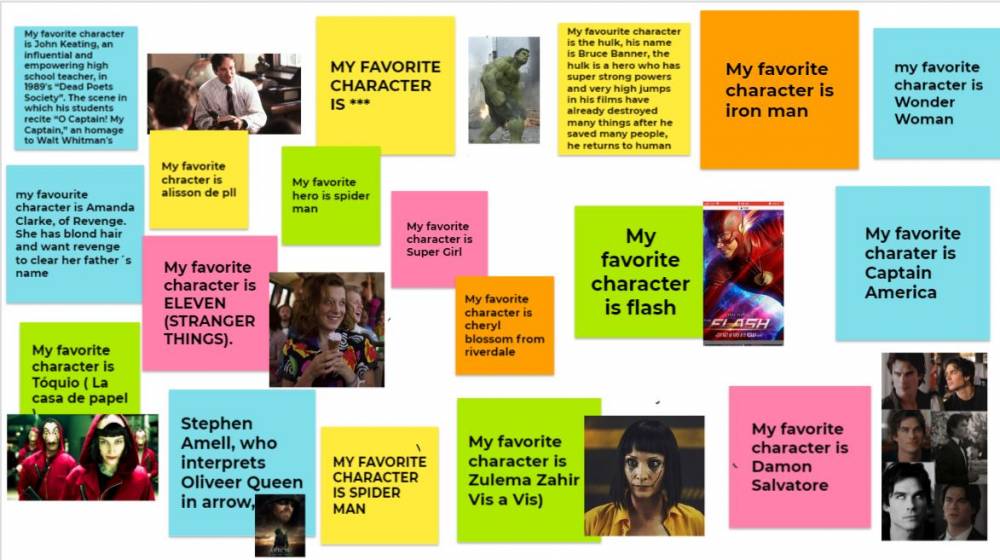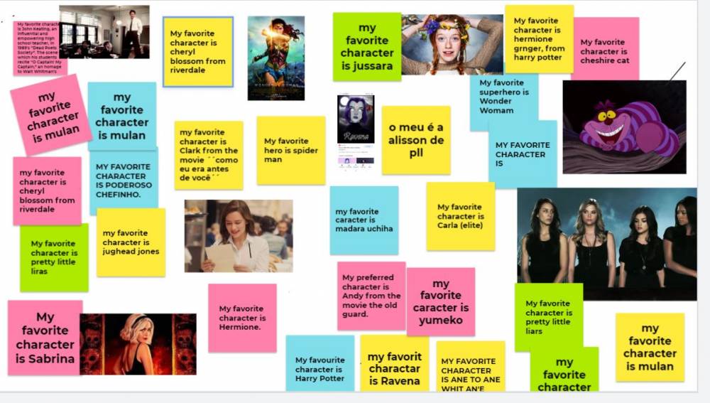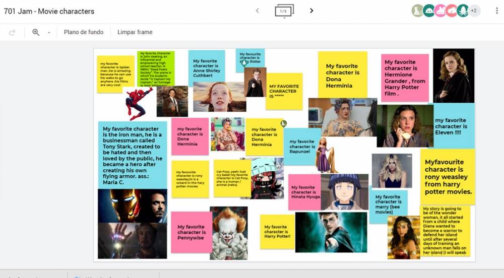 A atividade "My favorite movie character", do 7º ano fundamental do CENSA, foi corrigida de forma colaborativa, na manhã de 13 de julho. Através do aplicativo Jamboard, que utiliza a tecnologia em nuvem para criar texto e/ou desenhos, os alunos acessaram ao mesmo tempo a ferramenta de edição, sem sair da aula on-line, e criaram um texto conjunto sobre diversos personagens.