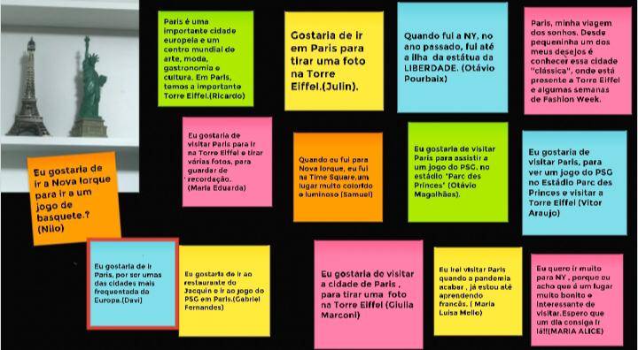 Iniciando os estudos de advérbios, o 7º ano fundamental do CENSA participou de uma interessante dinâmica, na aula de Língua Portuguesa, de 16 de julho. Utilizando a ferramenta "Jamboard" e partindo de imagens de cidades famosas, os alunos produziram post its com pequenas frases usando advérbios de lugar.