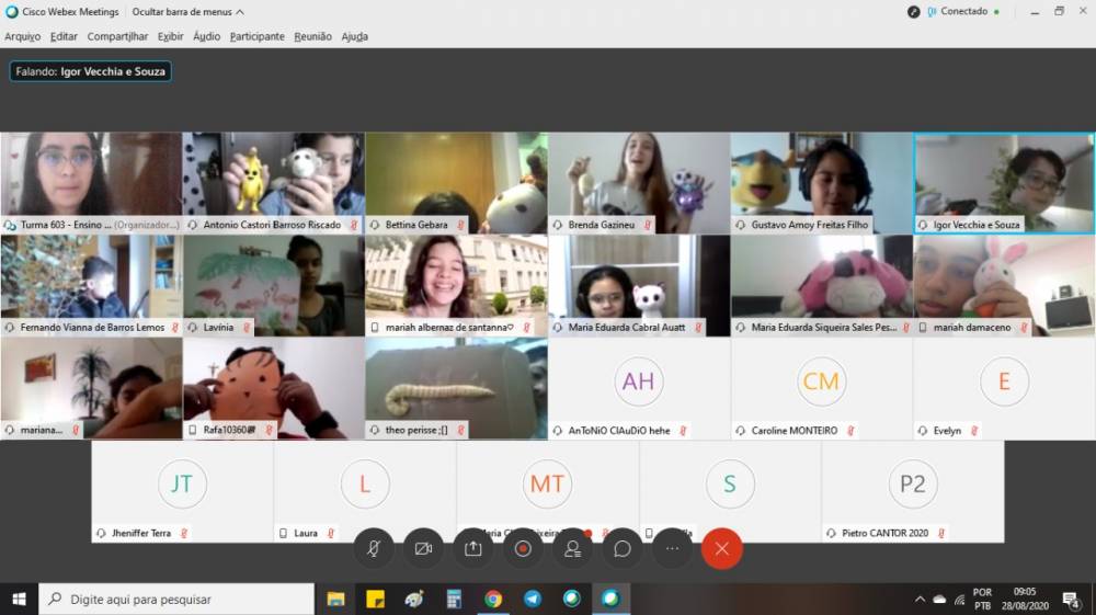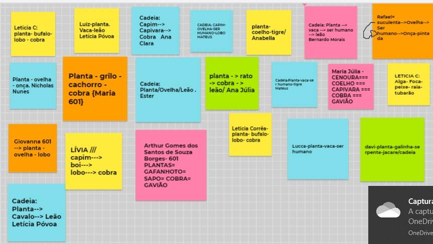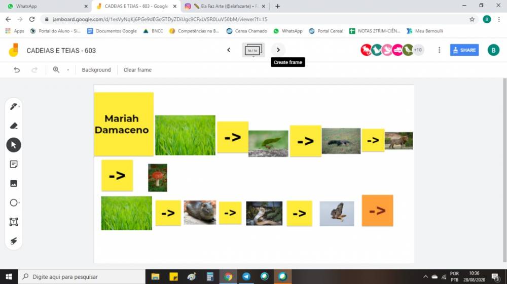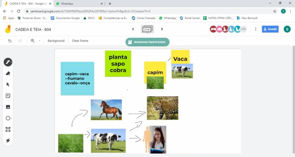 Estudando os ecossistemas e cadeia e teia alimentar, o 6º ano fundamental do CENSA ilustrou o tema com objetos encontrados em suas residências: pelúcias, roupas com estampas de animais, máscaras ou os próprios animais de estimação. Foram construídas as cadeias alimentares com os organismos apresentados na aula e, partindo delas, as teias. Todo o estudo foi registrado de forma digital, utilizando a ferramenta Google Jamboard.