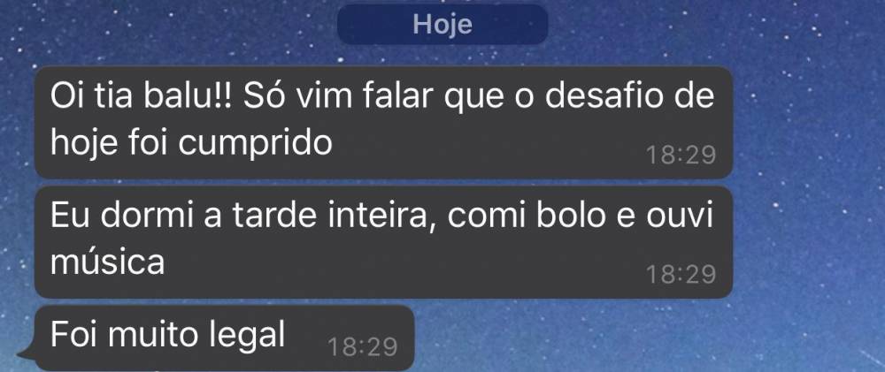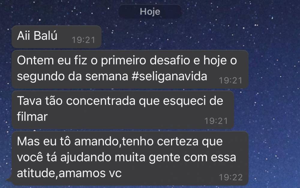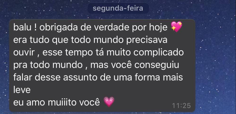 - Ainda que no meio do projeto, já estamos colhendo frutos através do depoimento de pais e de alunos."Obrigada por hoje!", "Esse tempo está muito complicado para todo mundo, mas você conseguiu falar desse assunto de uma forma mais leve", "Eu adorei esse desafio! Ele me deixou tão leve, relaxada" foram algumas das muitas mensagens recebidas - disse Anna Luísa.