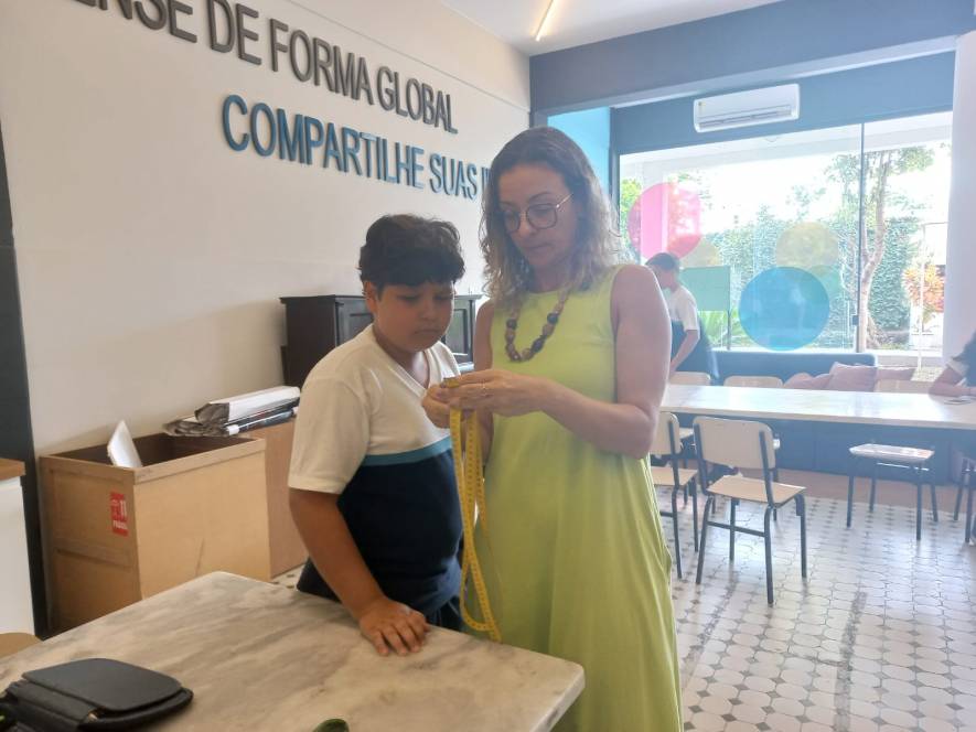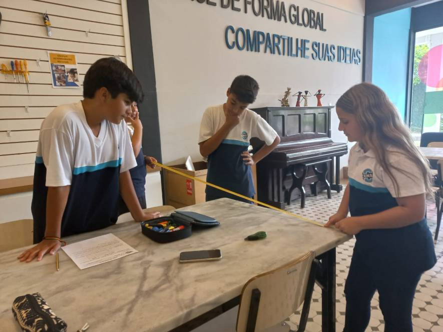 Num segundo momento, desta vez na sala maker, as atividades foram de medição utilizando unidades não padronizadas, fita métrica, balança, copos de medidas e a construção do metro quadrado. Foram utilizados diferentes recursos partindo da problematização do conteúdo, incentivando o exercício da análise e reflexão para generalização das regras envolvendo as principais grandezas e medidas. "Os materiais manipuláveis facilitam e estimulam a aprendizagem e o desenvolvimento de habilidades", explicou Fernanda.