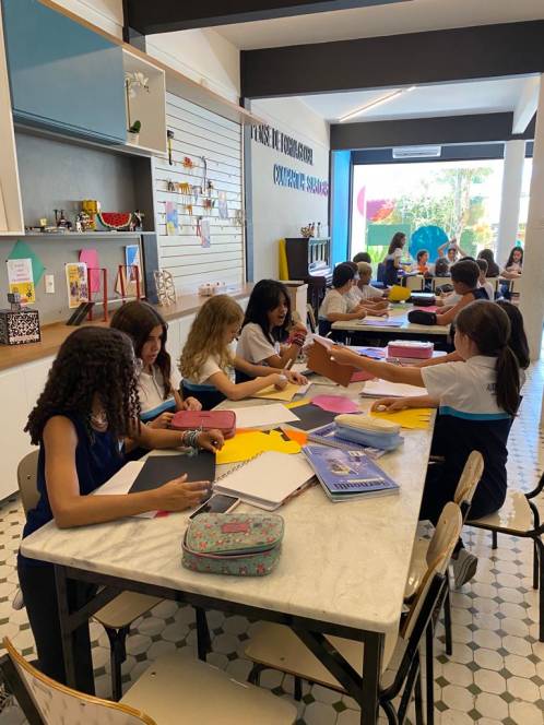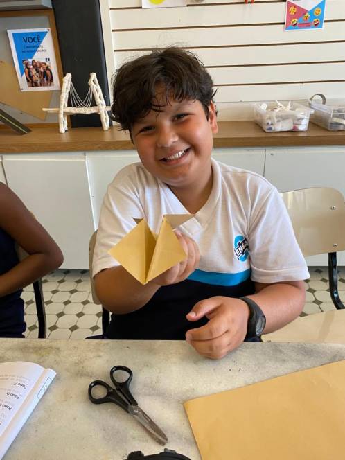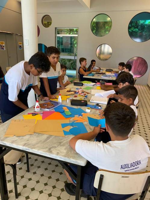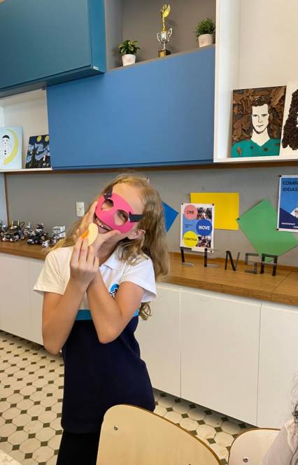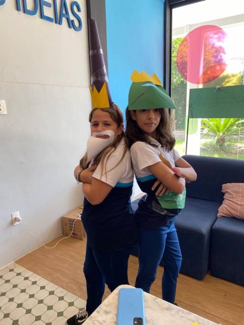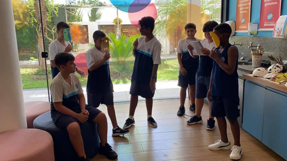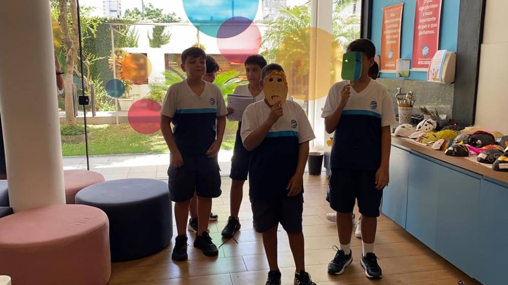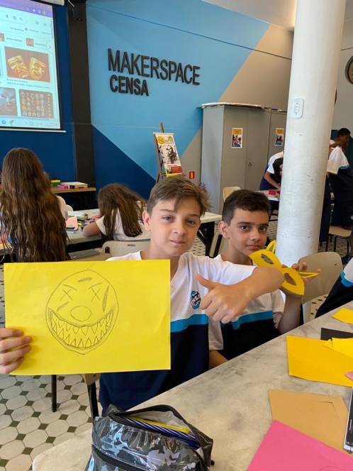 O espaço maker foi a sala de aula da disciplina de Redação para o 7º ano fundamental do CENSA, na sexta-feira, 3/03. Estudando o gênero textual dramático, os alunos conheceram a origem do teatro grego e as duas faces do gênero (tragédia e comédia). Partindo para a prática, construíram máscaras, simbolizando o teatro, e encenaram textos e personagens criados por eles mesmos, numa dinâmica descontraída e aprendizagem significativa.