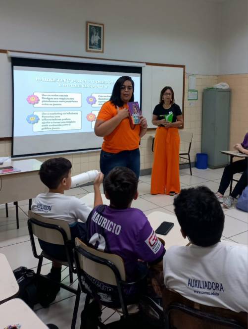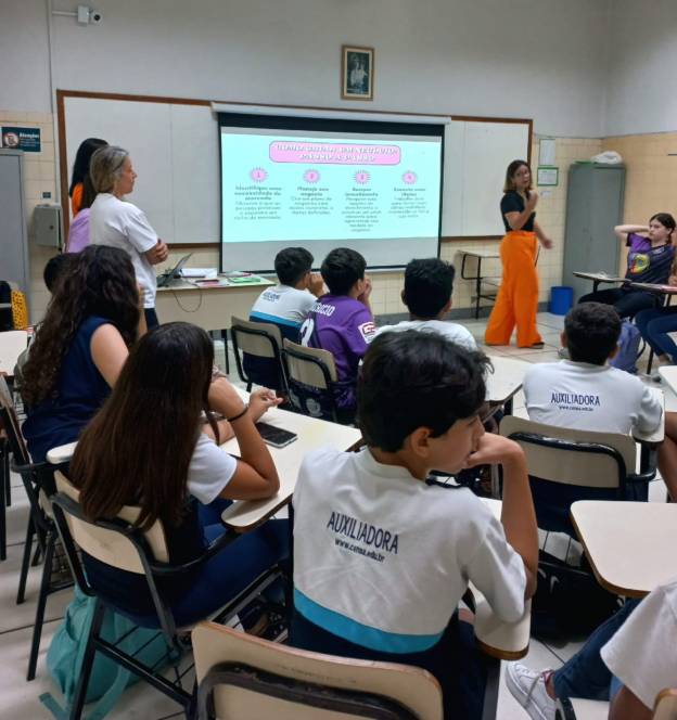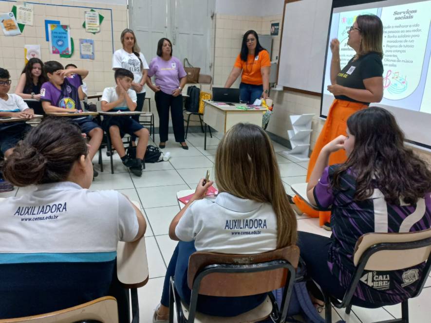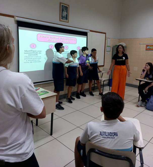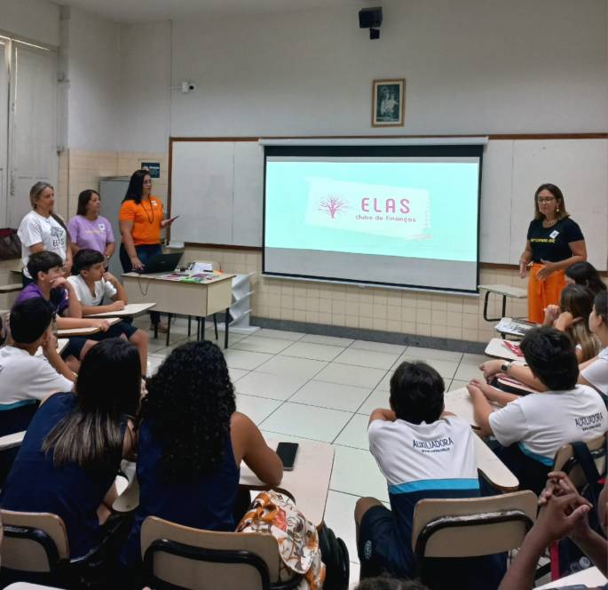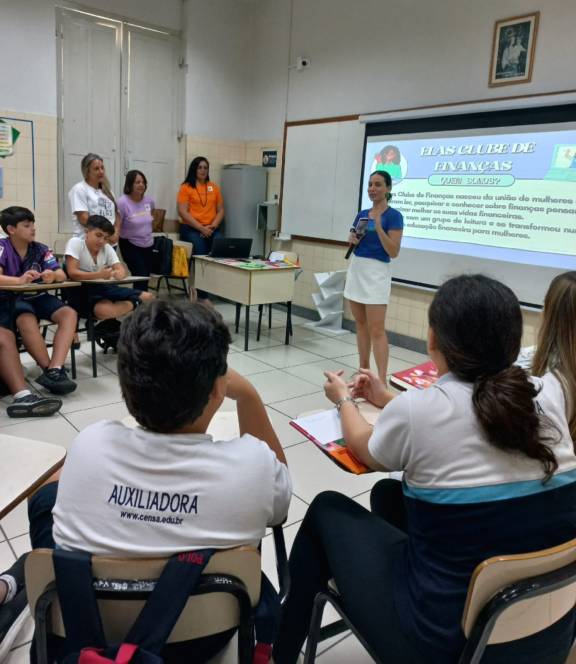 O 7º ano fundamental do CENSA recebeu as sócias do Elas Clube de Finanças, para uma palestra, na sexta-feira, 25/08. O objetivo da visita foi trazer mais informações sobre o tema do projeto desenvolvido pela turma 703, "Um olhar sobre o Empreendedorismo Sustentável: uma cantina inovadora", que será apresentado na Semana Intercultural do CENSA, desse ano. Viviane Coutinho, Ana Paula Bessa, Joilça Barbosa, Gisela Menezes, Silvia Nascimento e Juliana Viana mostraram aos alunos a importância da Educação Financeira pessoal e familiar, reforçando que "empreender é transformar ideias em ações, com responsabilidade social". Muito interessada, a turma participou ativamente, com questionamentos e relatos pessoais. As convidadas ainda presentearam a escola com uma minibiblioteca, com 20 livros sobre o tema. Obrigada, Elas Clube de Finanças! Sua contribuição foi o máximo!