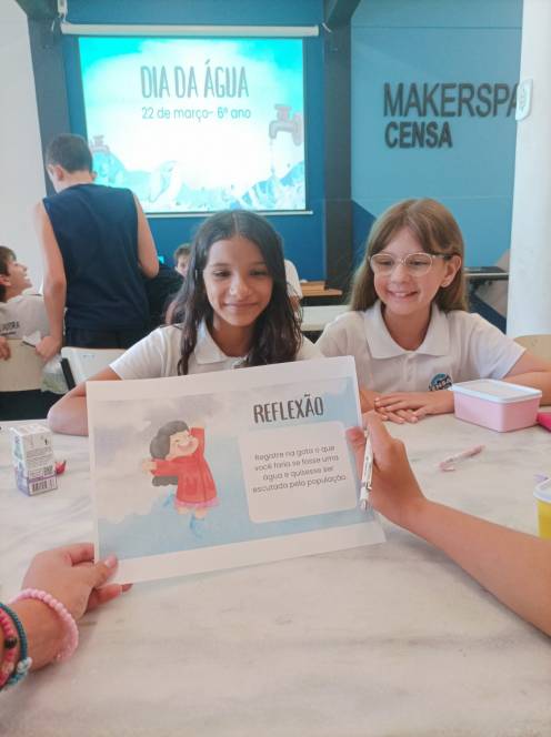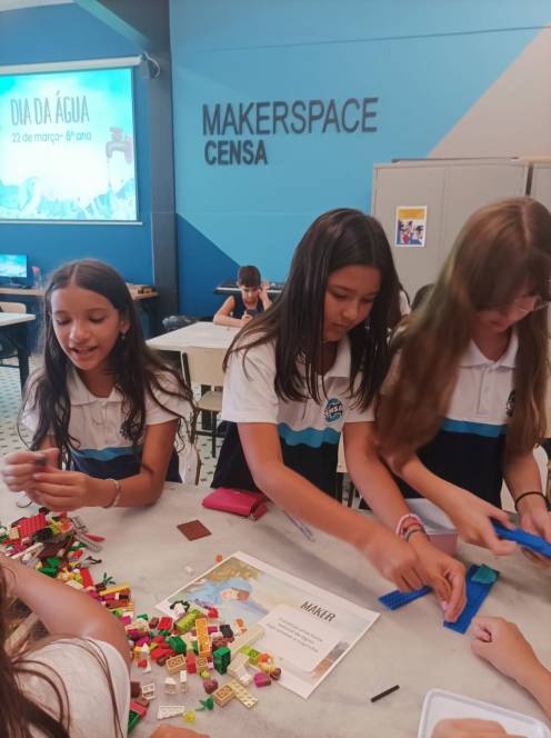 O Dia Mundial da Água, 19 de março, foi tema de estudo e reflexão para o 6º ano fundamental do CENSA. Utilizando a metodologia por estações, as turmas abordaram as várias vertentes do assunto. A primeira foi a pesquisa, explorando a importância e disponibilidade desse recurso. A segunda incluiu a criatividade. Numa atividade maker, os alunos construíram fontes de água sustentáveis, utilizando o lego. Em seguida, partiram para a reflexão, colocando-se no lugar de uma gota dágua, até finalizarem com a estação "Ação", montando um quebra-cabeças onde destacava-se a mensagem de que o cuidado com a água é responsabilidade de todos.