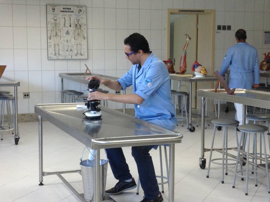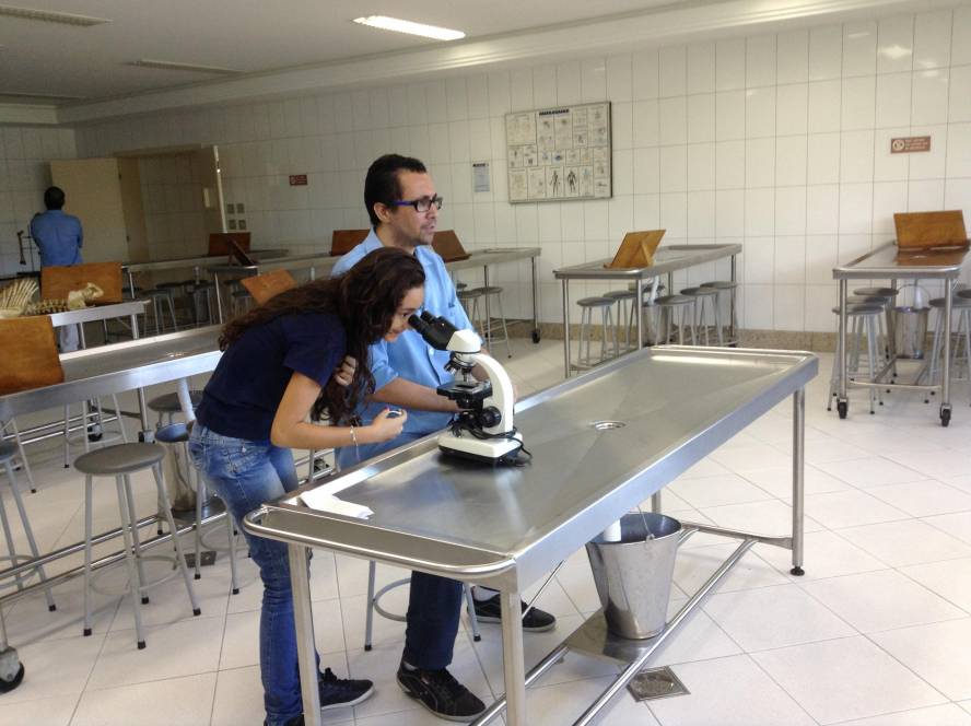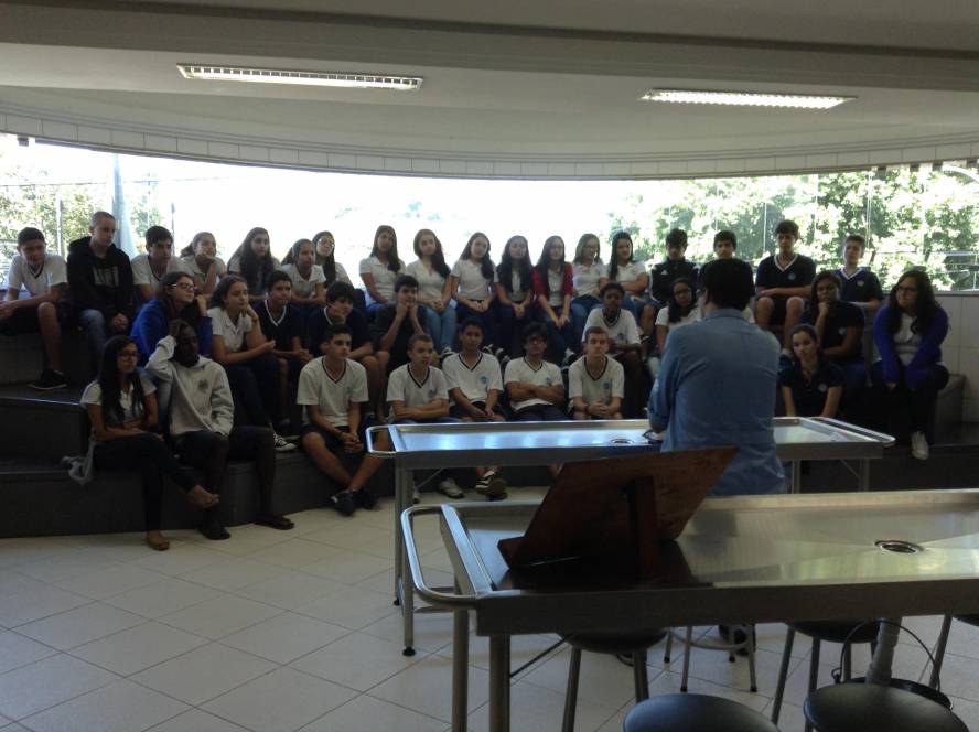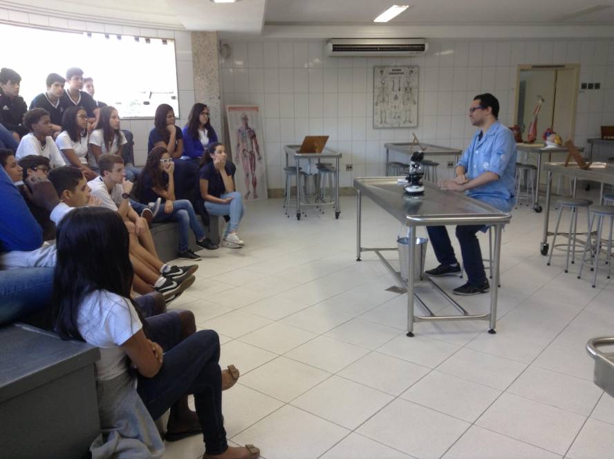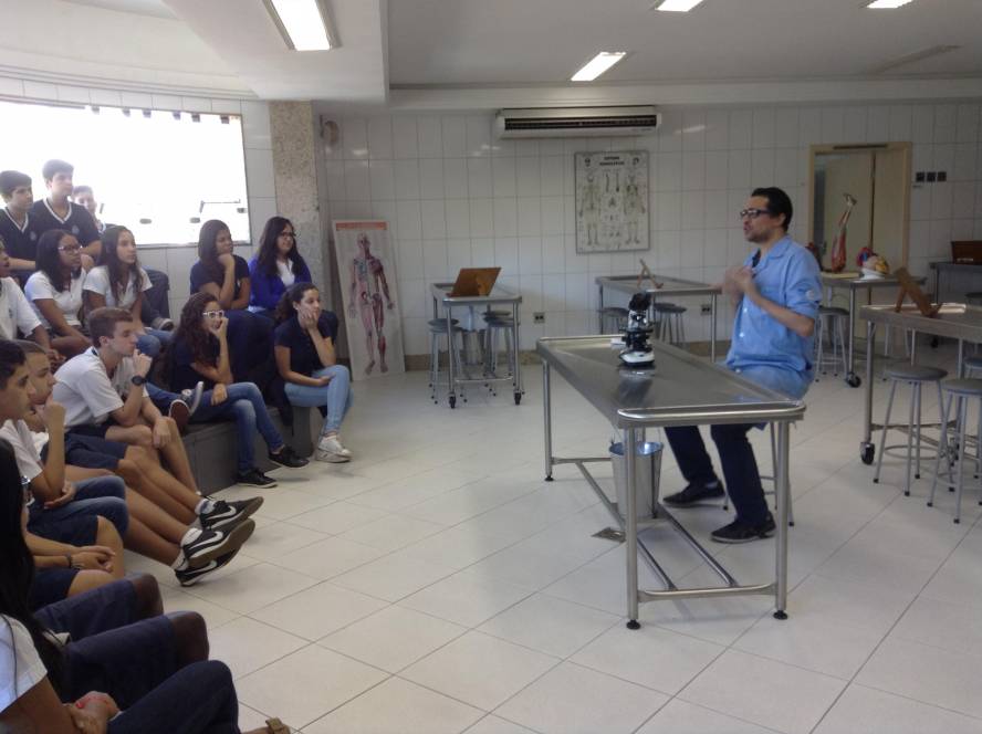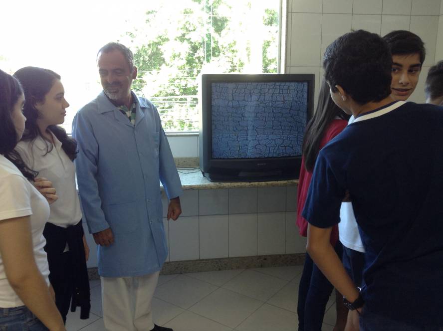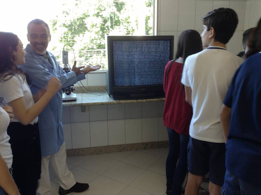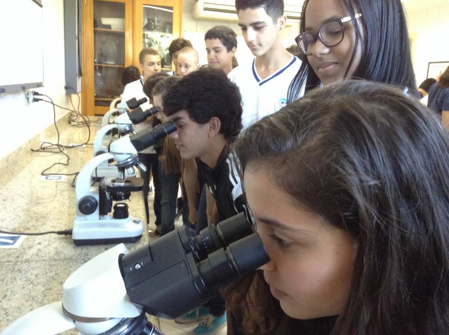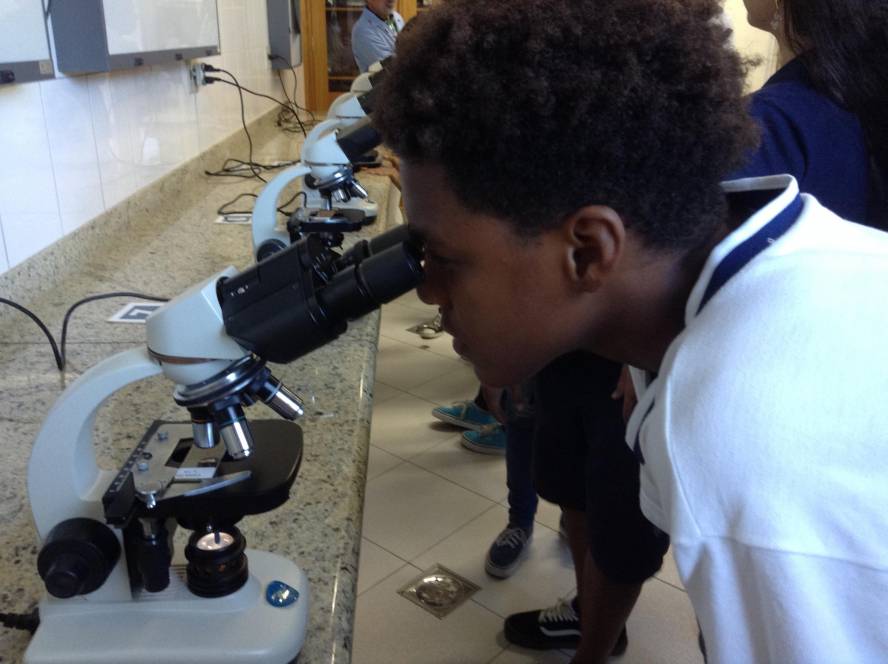 Desta vez, o 9º ano do Ensino Fundamental teve a sua aula de Biologia no Laboratório de Microscopia. Ali observaram lâminas de tecidos animais e vegetais e identificaram as partes ópticas e mecânicas através do microscópio, realizando ações que em laboratórios médicos são utilizadas para o diagnóstico de várias doenças, inclusive o câncer.