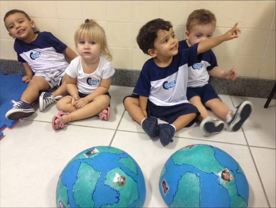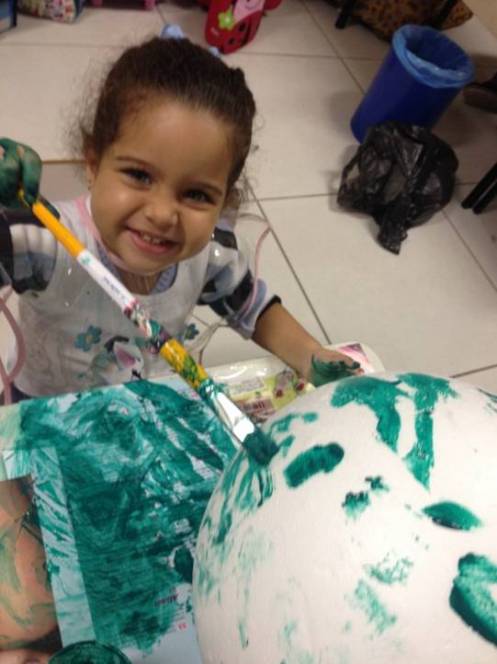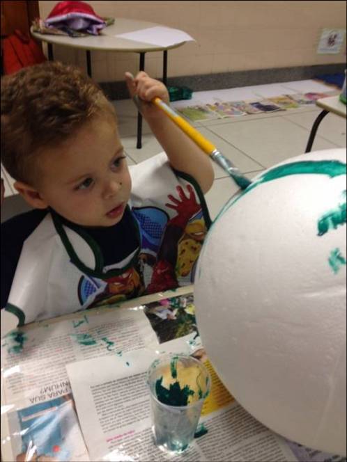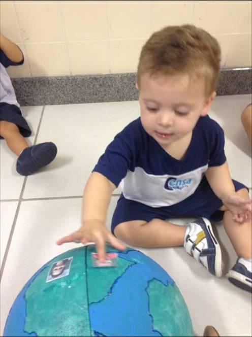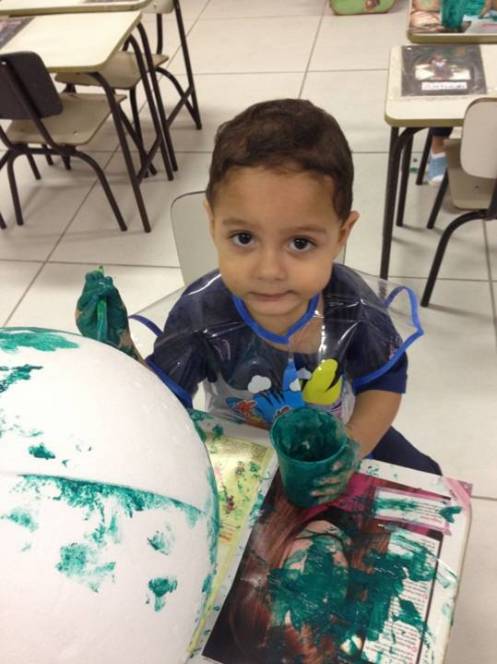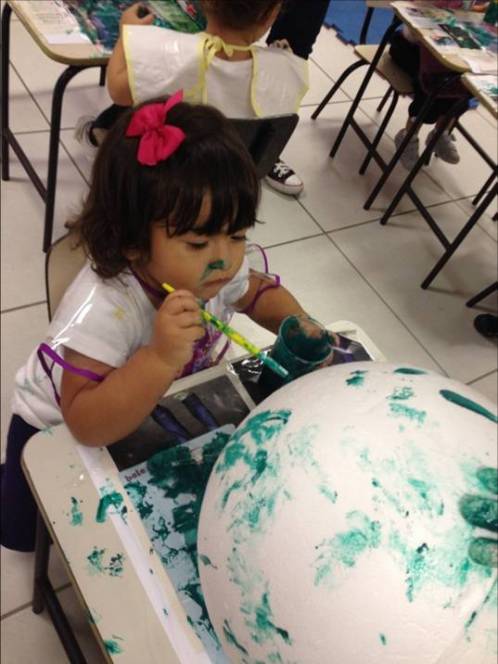 Para representar e concretizar algo que é tão abstrato para esses pequenos, as crianças confeccionaram um mundinho, utilizando isopor, tinta e muita criatividade. Para facilitar ainda mais a assimilação do que é um mundo e quem vive nele, as crianças colaram imagens delas, imagens que representam a natureza e o meio ambiente.