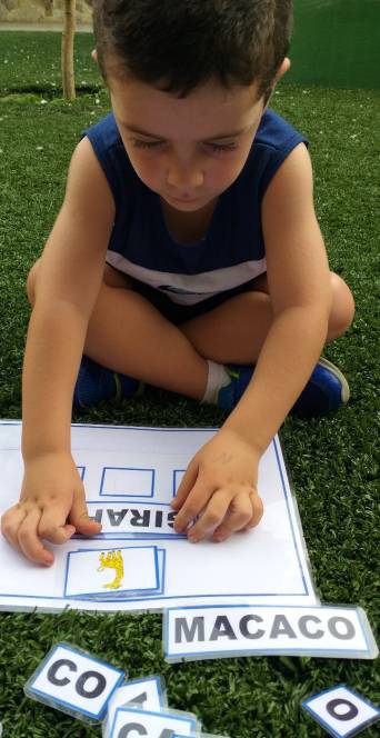 "Qual o nome do animal?" Essa foi a pergunta feita aos pequenos do 2º período da Escola Infantil, na atividade de 2 de julho. Cada criança recebeu um tabuleiro onde deveriam fixar o desenho do animal preferido. Em sequência, colocaram o nome correspondente, as sílabas e, por fim, as letras, formando o nome de cada um.