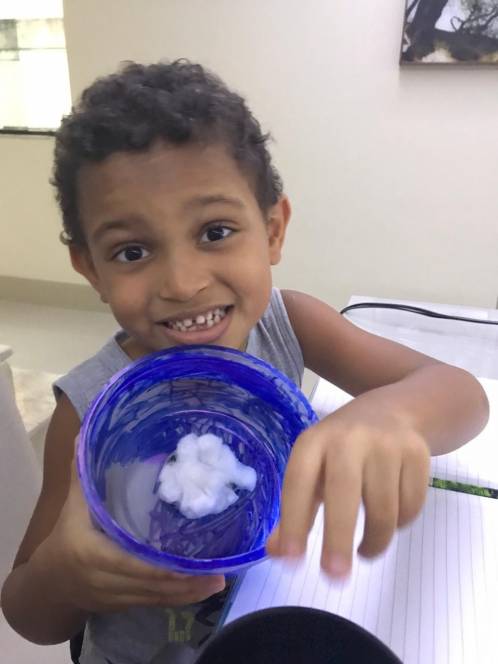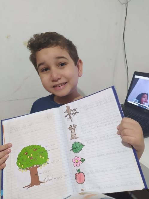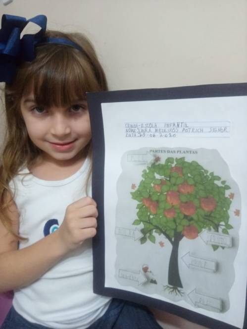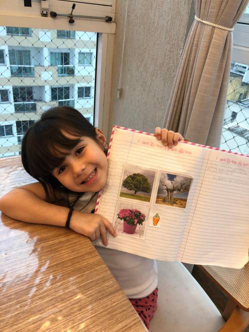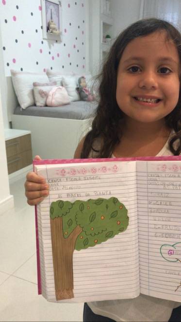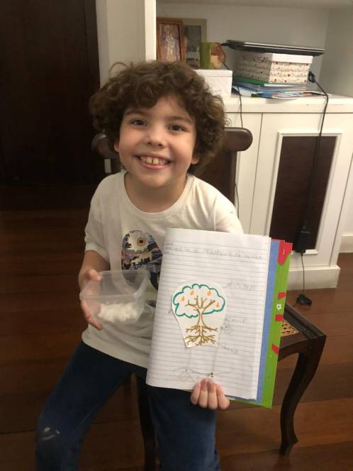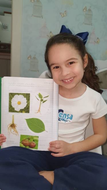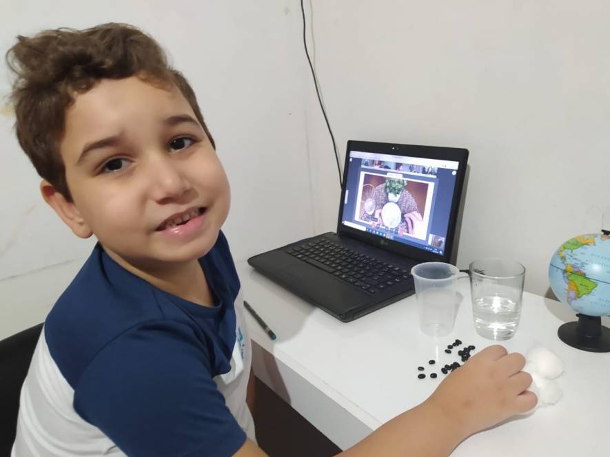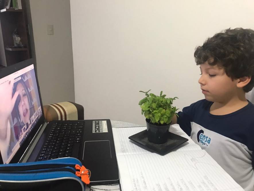 Além do aspecto afetivo, o livro possibilitou conhecer os cuidados com a natureza e, assim, em uma aula invertida, as crianças pesquisaram as partes das plantas e a importância de cada uma, assistindo a vídeos e explicações das professoras. A criançada ainda plantou um pé de feijão e aprendeu os procedimentos para cultivá-lo. Em 29 de junho, as descobertas foram partilhadas no encontro online, num momento de grande interação e entusiasmo.