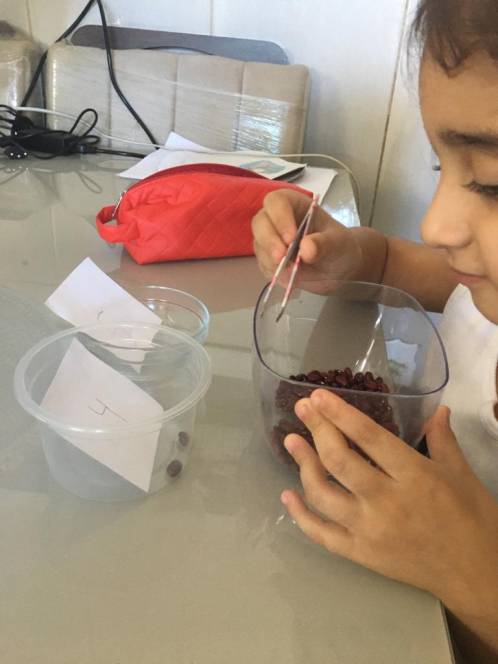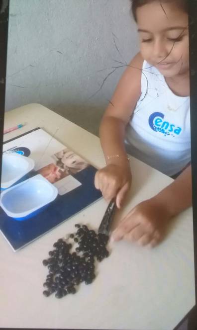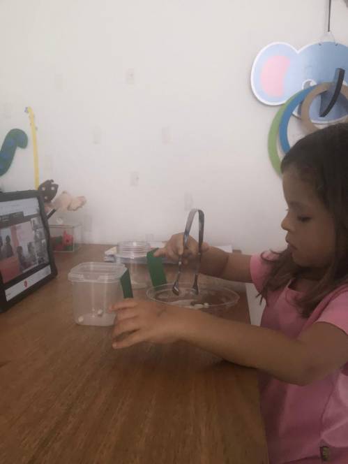 A aula de matemática de 25 de fevereiro do 2º período da Escola Infantil do CENSA foi destinada ao estudo dos números 4 e 5. Unindo teoria e ludicidade, a criançada participou de uma dinâmica utilizando feijões, pinças e potes, relacionando o numeral à quantidade a ser colocada no recipiente.