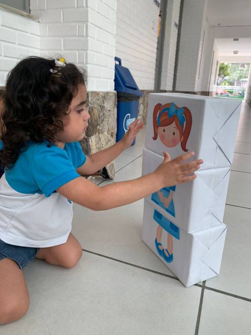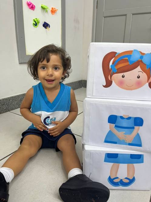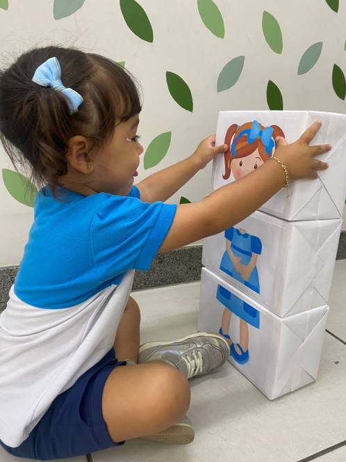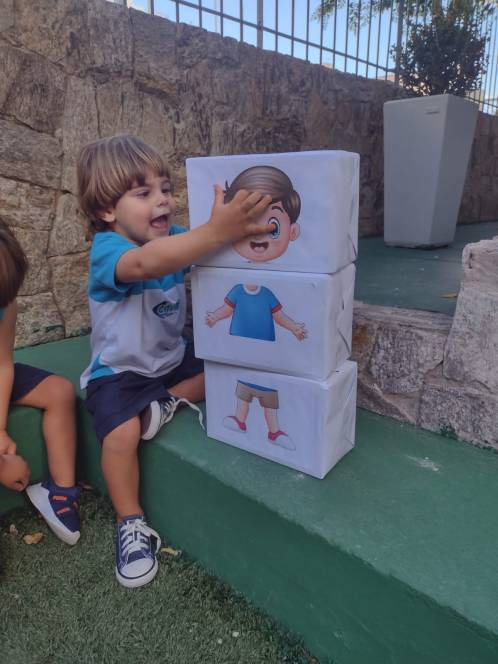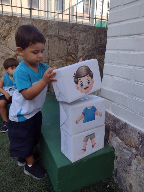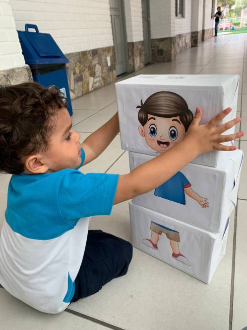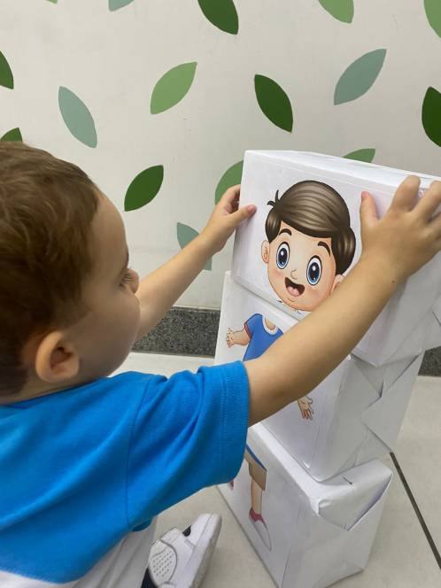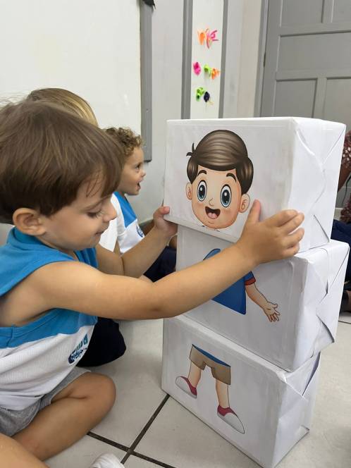 Numa atividade divertida e lúdica, o Maternal da Escola Infantil do CENSA montou um quebra-cabeças do corpo humano, na segunda-feira, 20/03. Feito de caixas e imagens de partes do corpo feminino e masculino, o jogo permitiu que os pequenos identificassem e organizassem as peças, desenvolvendo sua autonomia e identidade corporal.