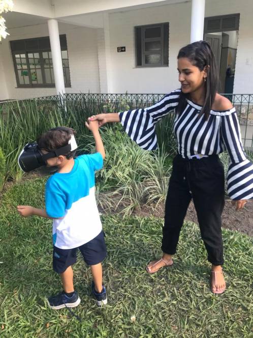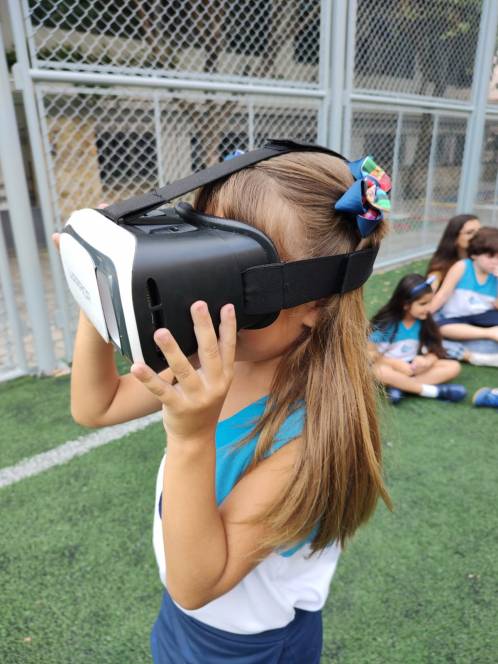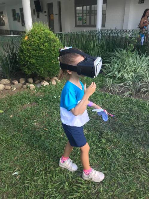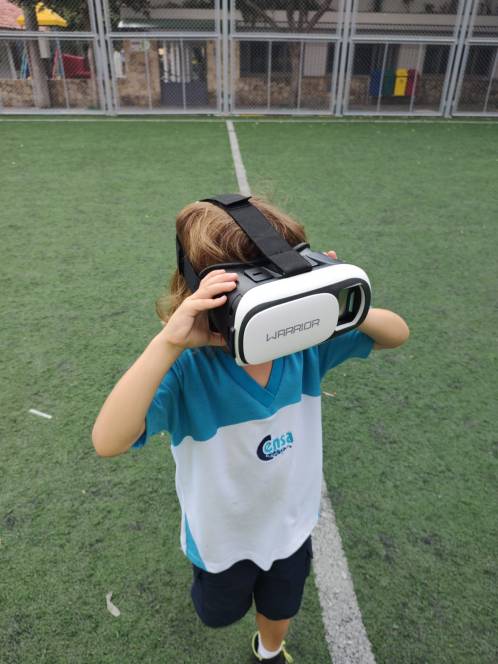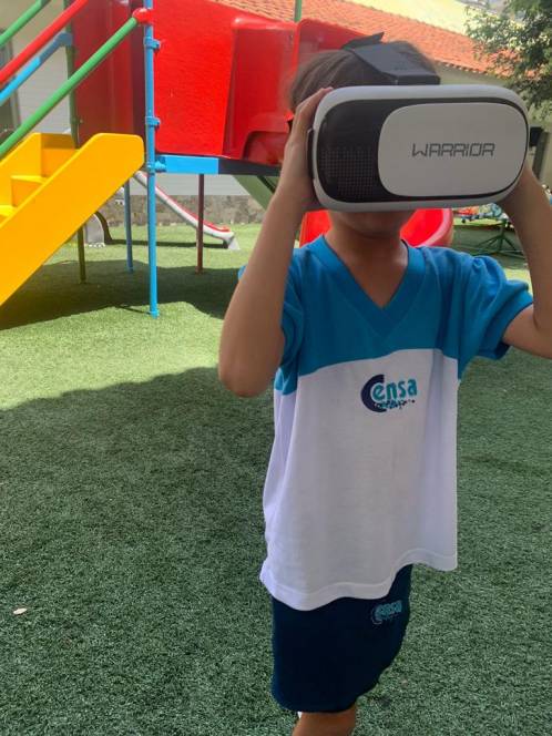 Trabalhando a letra C e sua família silábica, o 3º Período da Escola Infantil do CENSA participou de uma atividade bem moderna, na sexta-feira, 24/03. Com óculos 3D, as crianças assistiram o vídeo "A Fazenda do Zenon". O objetivo era encontrar o animal que começasse com a letra estudada, o cavalo, e, para isso, "passearam" pela fazenda utilizando a realidade virtual. "´Buscamos as inovações para abordarmos os conteúdos trabalhados. Isso motiva os alunos e os familiariza com as tecnologias", disse a coordenadora Liliana Nogueira.