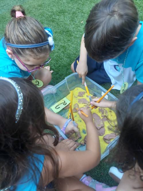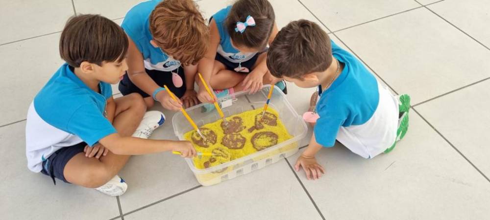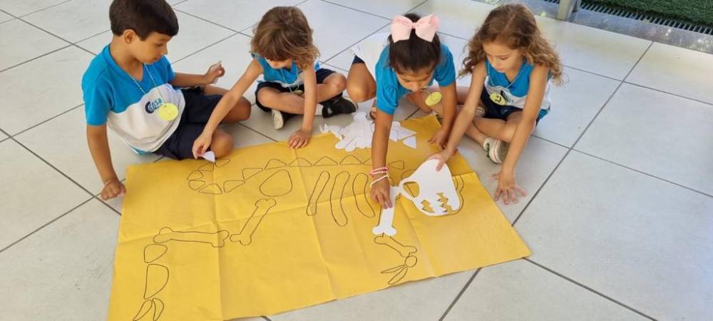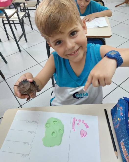 Dinossauro foi o tema escolhido pelo 3º Periodo da Escola Infantil do CENSA para contextualizar a aprendizagem da letra D. Empolgados, os alunos começaram com um tour virtual ao Museu de Paleontologia Irajá Damiani Pinto, onde conheceram os fósseis, espécies e vida do animal. Em seguida, participaram de uma proposta de metodologia ativa, com a rotação por estações. Nesse dinâmica, cada estação apresenta uma atividade diferente e todos podem participar com suas respectivas equipes. A primeira foi a do quebra-cabeça do esqueleto de dinossauro, que estimulou as habilidades lógicas, a percepção visual e a resolução de problemas; a segunda consistia na escavação dos fósseis, feitos de argila, onde os alunos exercitaram a atenção, o ritmo, a persistência e o foco para encontrar as peças escondidas sob a areia; a terceira estimulou a linguagem escrita e a leitura, pois os alunos tinham que formar palavras para descobrir características dos dinossauros.