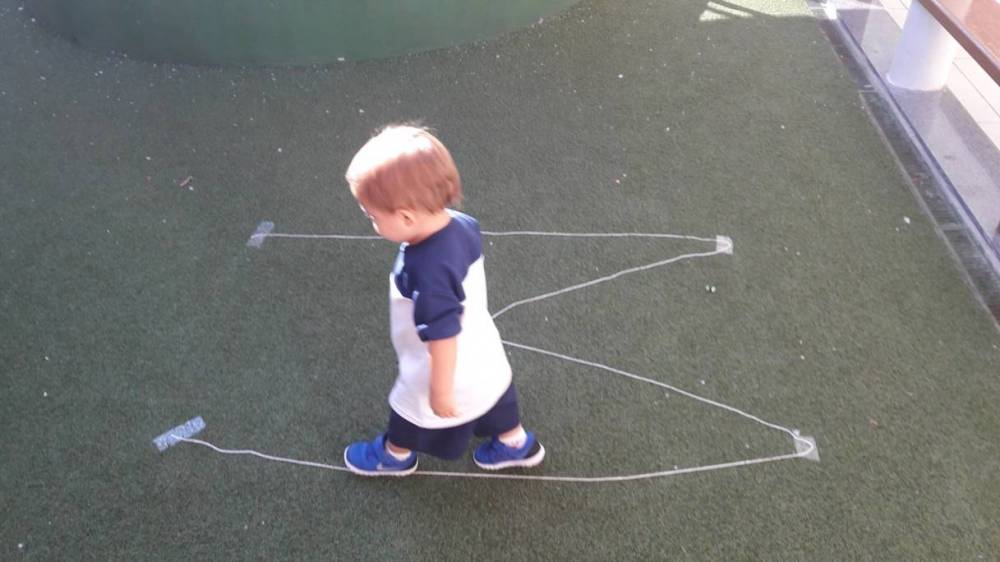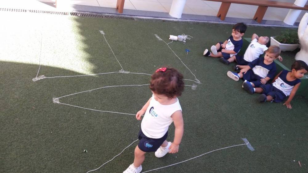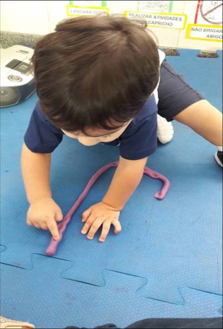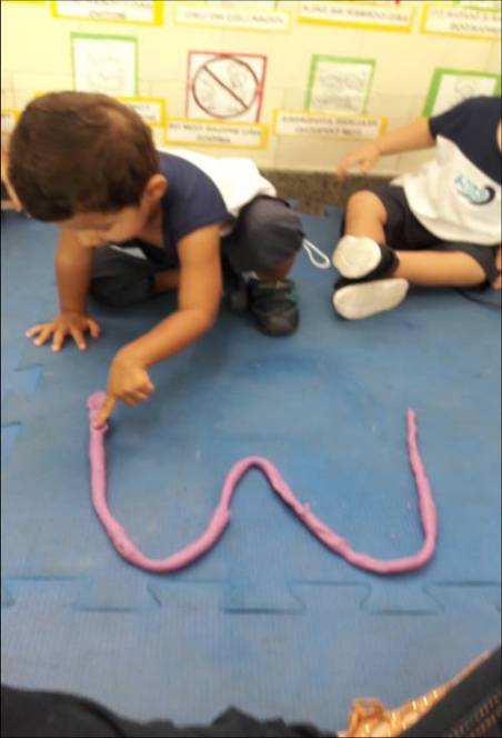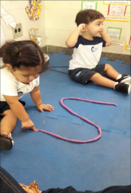 Cada criança caminhou sobre a letra inicial do seu nome, trabalhando a movimentação. Demos continuidade na sala, fazendo a movimentação da letra com massinha, que é um recurso muito apreciado pelas crianças.