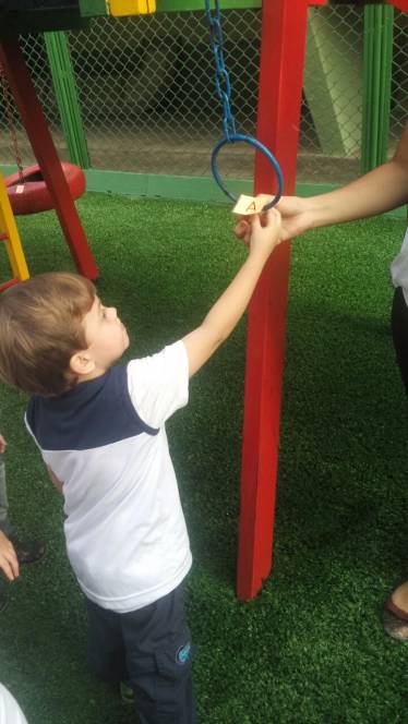 Brincando e aprendendo, o Maternal 02 partiu para o parquinho para uma nova atividade. Recebendo cada um uma letrinha, os alunos seguiram em busca de um brinquedo cujo nome começasse com a letra recebida. Foi uma alegria só!