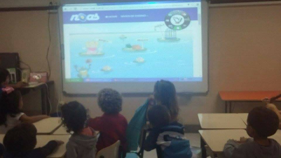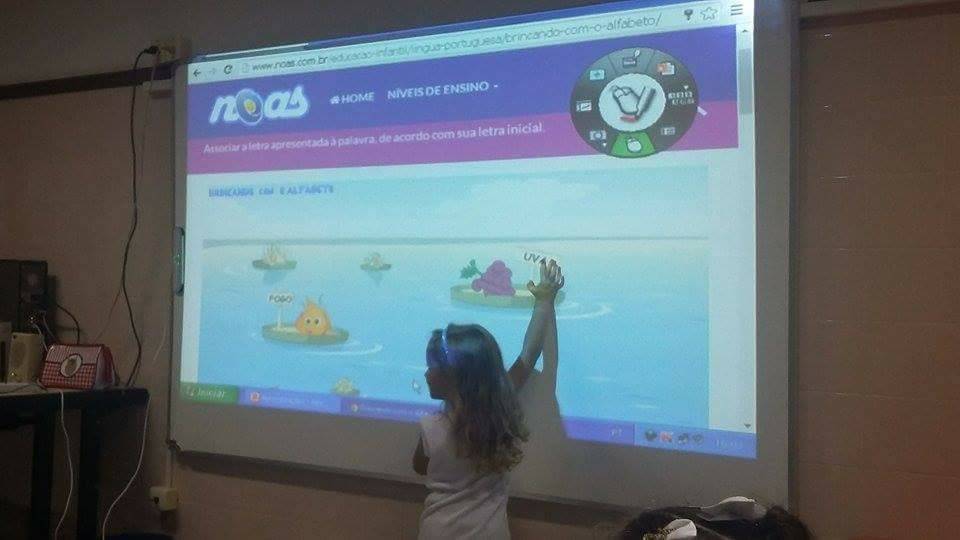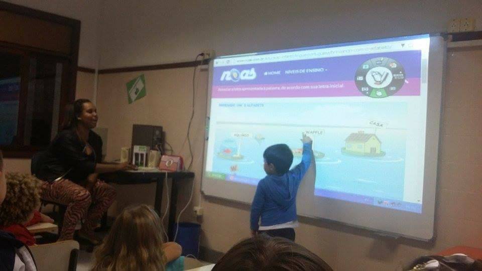 A turma do 1° período 13 está aprimorando o trabalho com as letras do alfabeto nas aulas de Informática, utilizando a lousa digital.