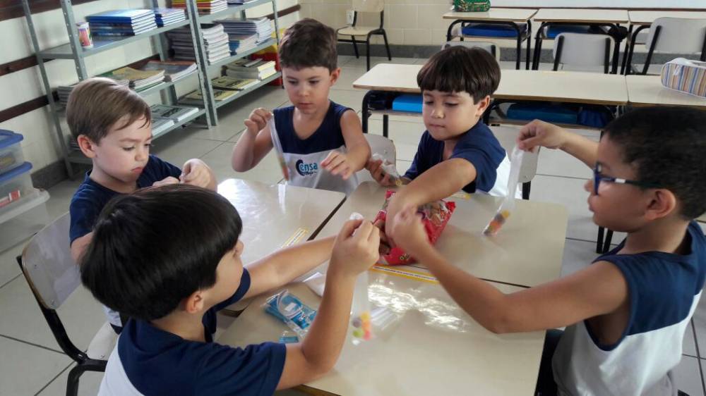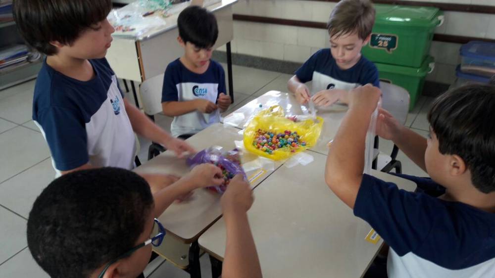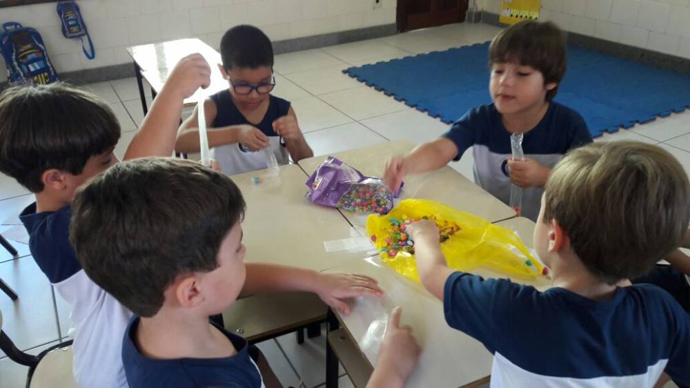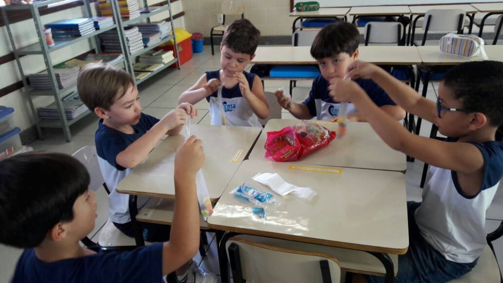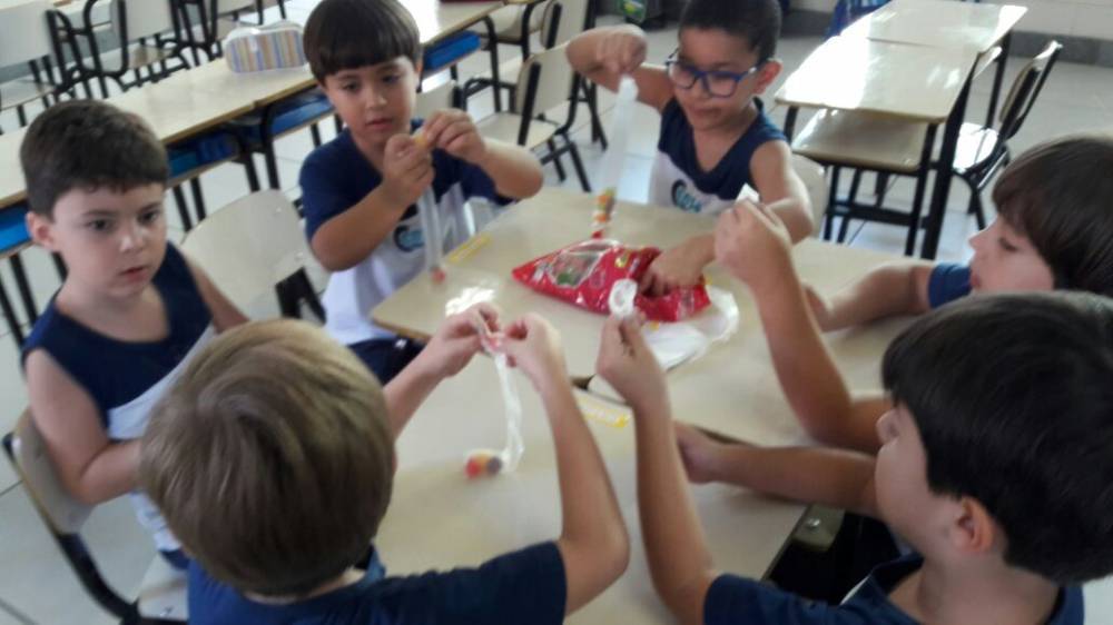 No momento utilizaram jujuba e amendoim para quantificar e partilharam seus conhecimentos apreendidos com as demais pessoas da escola.