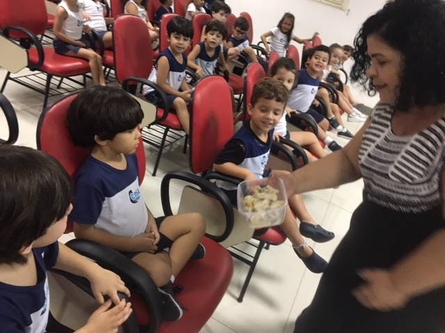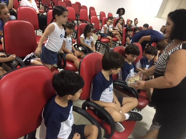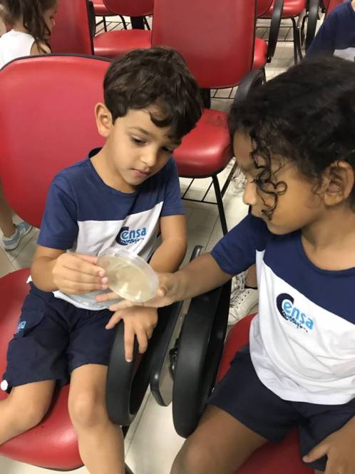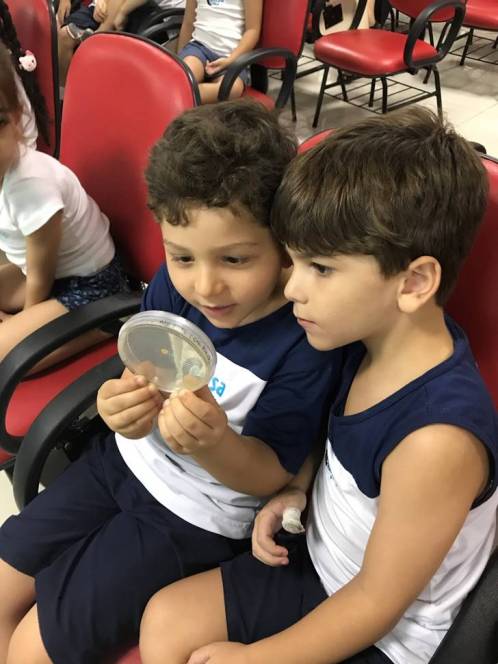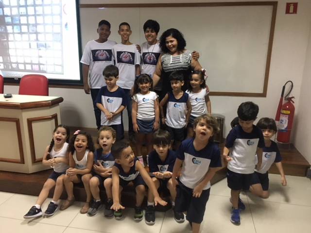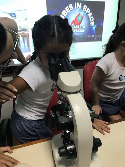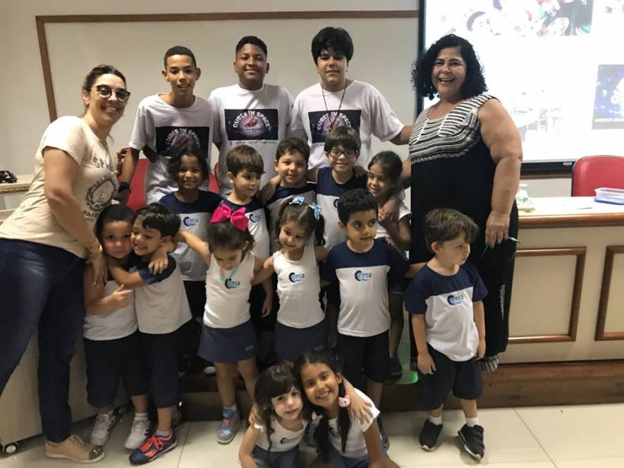 Desenvolvendo o projeto "Sistema Solar e seus mistérios", o 2º período da Escola Infantil do Auxiliadora recebeu uma visita muito especial para ilustrar o tema: o Quarteto Espacial do Cubes in Space. Acompanhados da professora Claudette Soares, os jovens cientistas, alunos da Escola Municipal Getúlio Vargas, contaram suas experiências em construir um satélite e enviar uma carne salgada, que contém uma arqueobactéria halofílica que permite maior conservação no espaço, e, ainda convidaram os pequenos a observarem a espécie no microscópio.