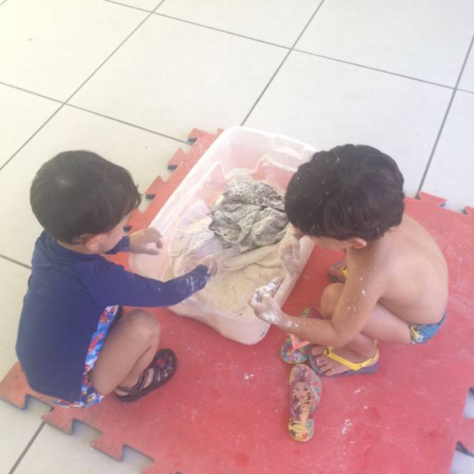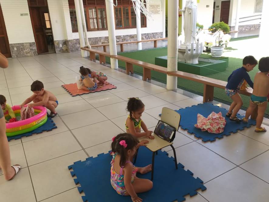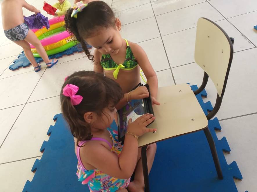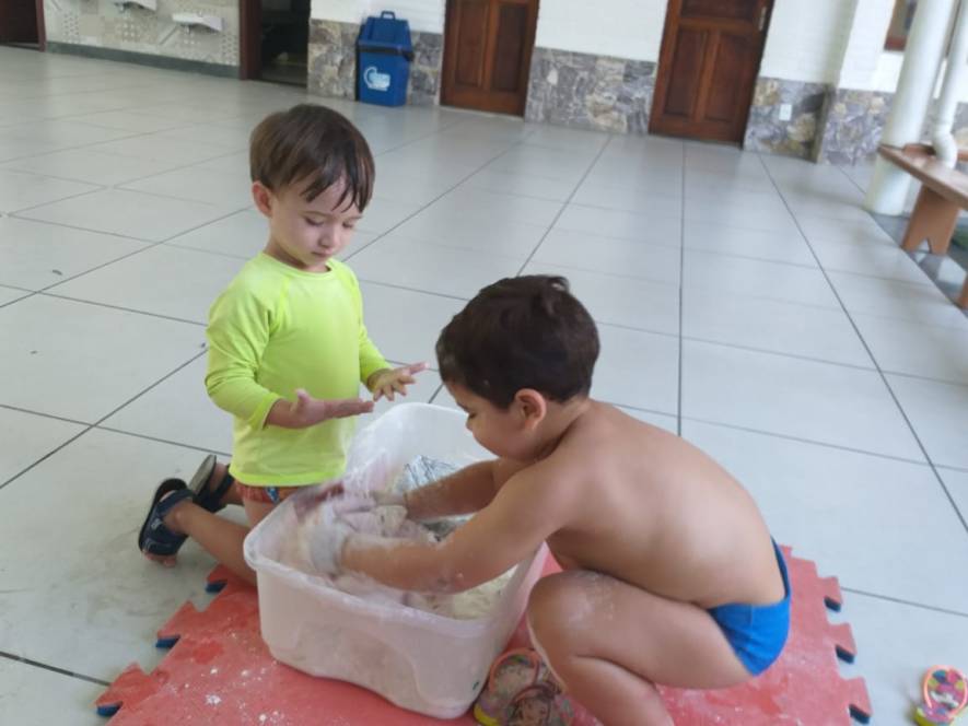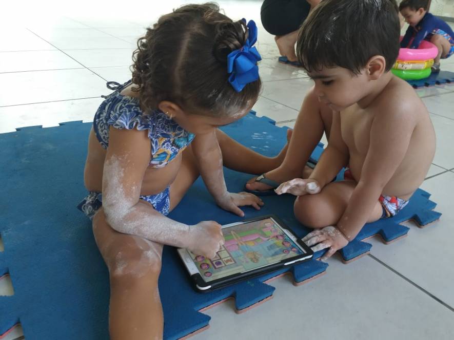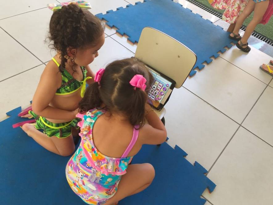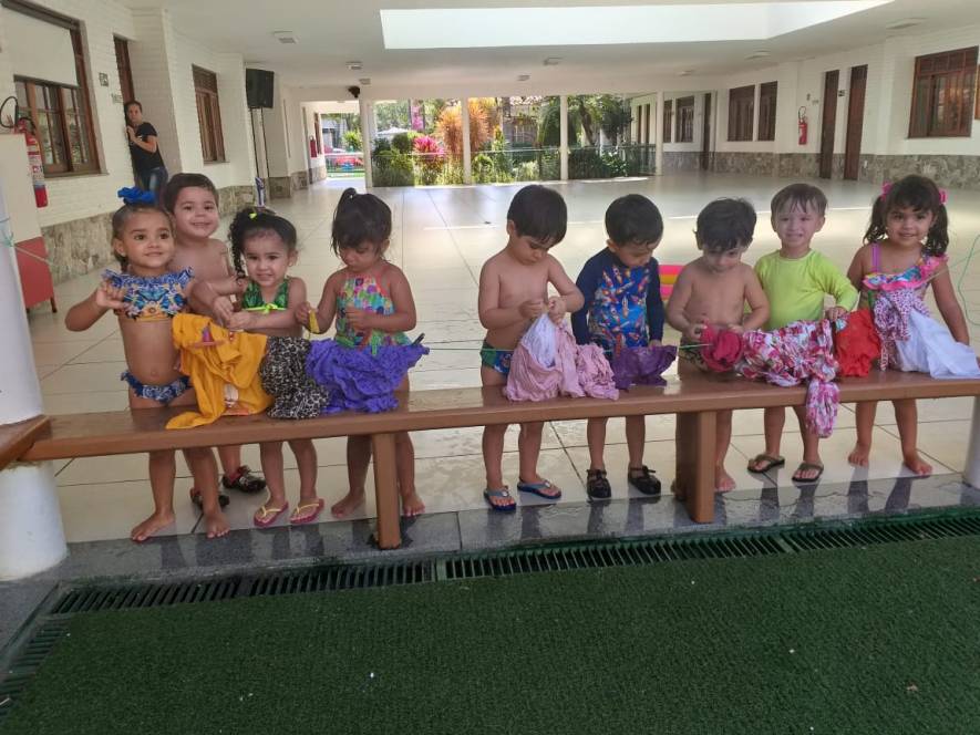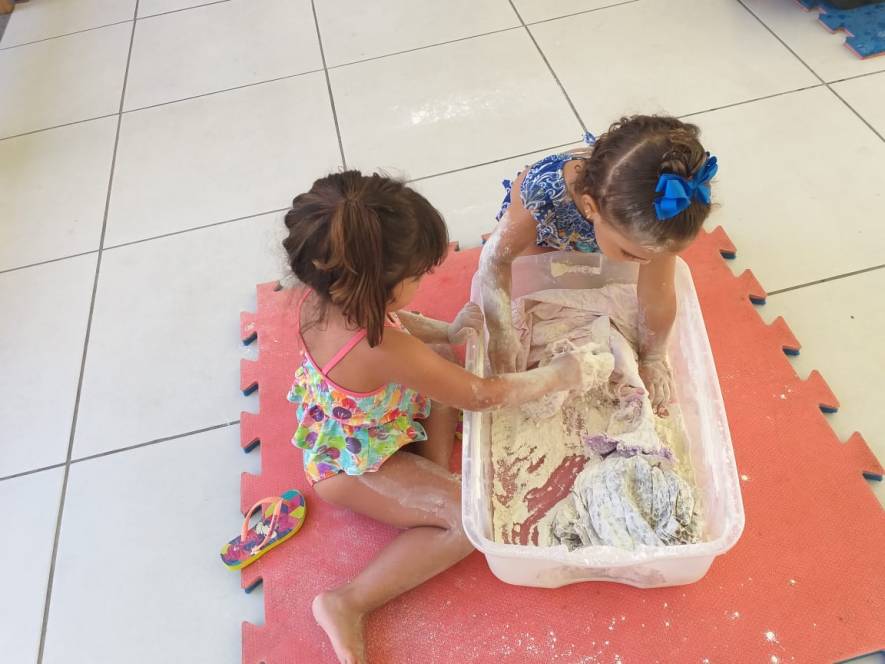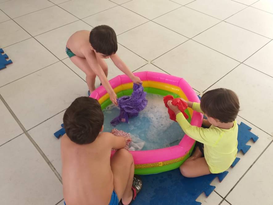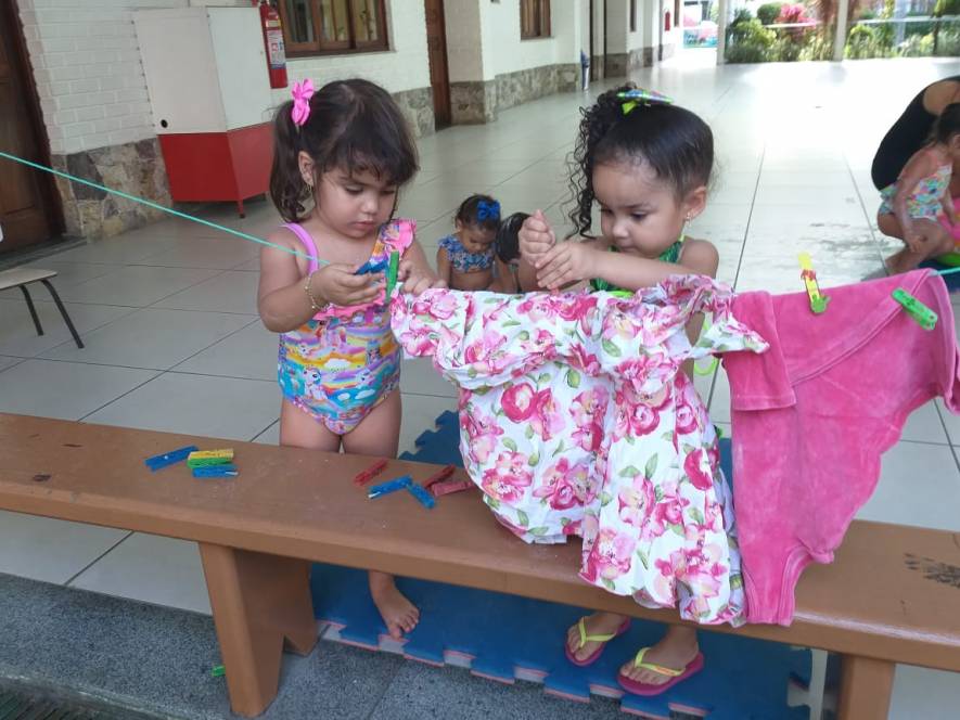 Colocando em prática a metodologia ativa, que valoriza a criação e a independência, o maternal da Escola Infantil do CENSA participou de uma atividade envolvendo um circuito. A dinâmica aconteceu na tarde de quinta-feira, 4 de outubro, e teve como ponto de partida um jogo de vestir as roupas dos bonecas. Um grupo ficou responsável por manusear a roupa no trigo, outro com a função de enxaguá-las e, o último, de estendê-las no varal.