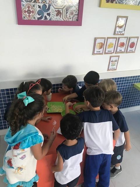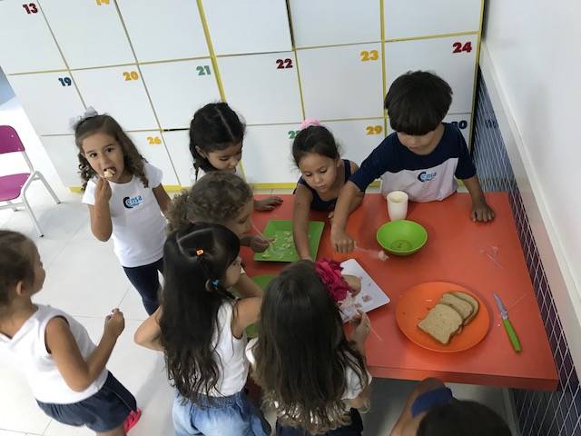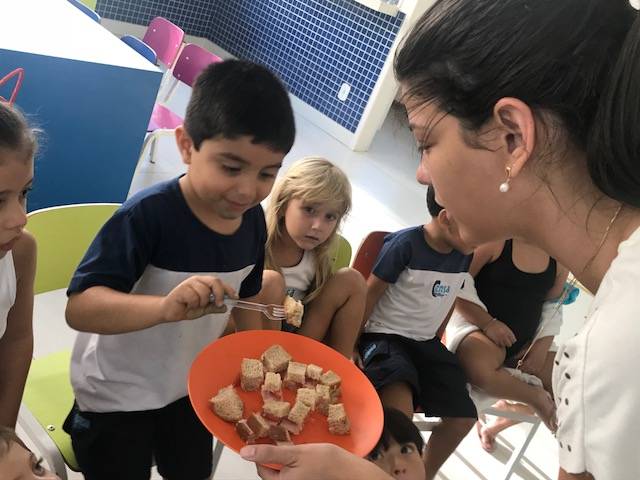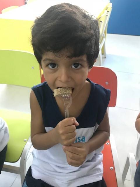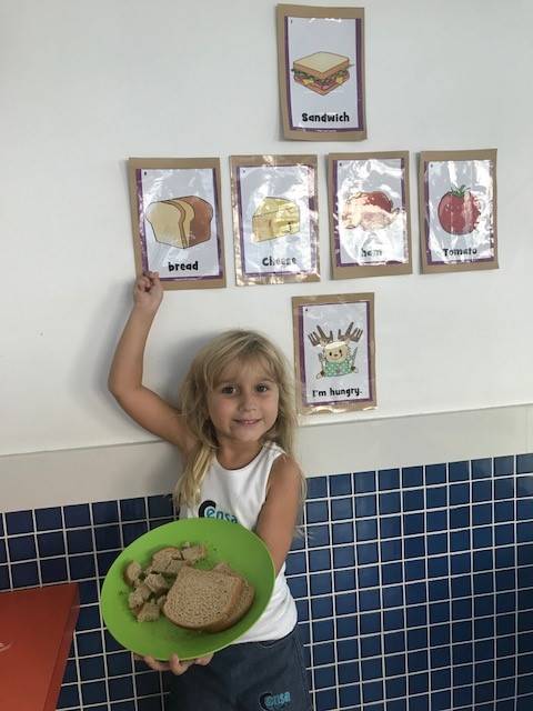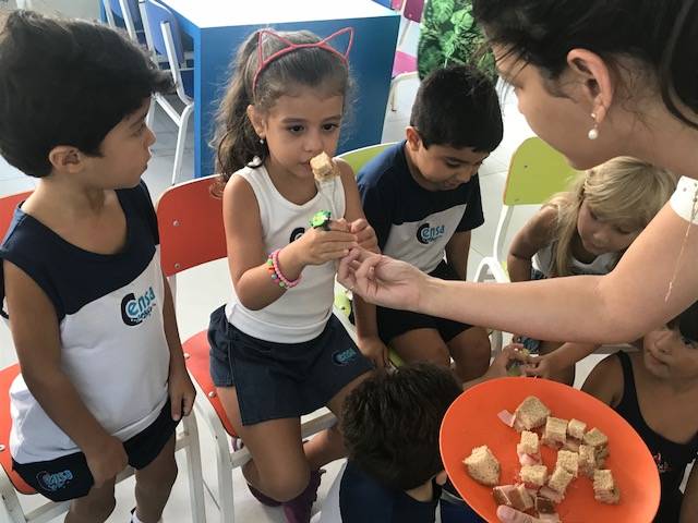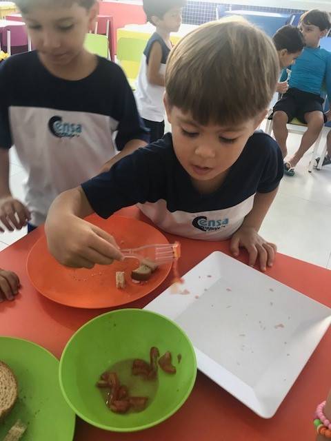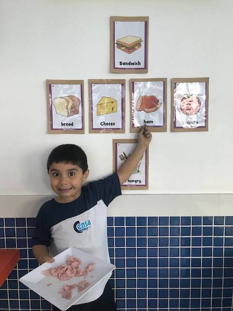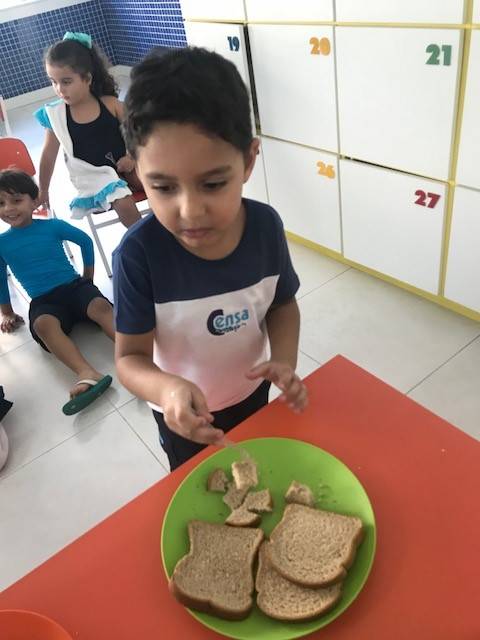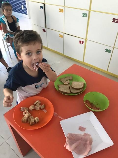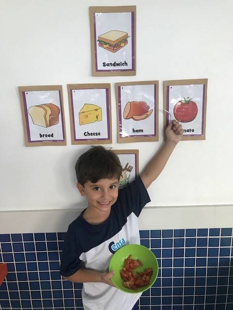 O 2º Período da Escola Infantil do CENSA está aprendendo na prática o vocabulário da unidade 2 do livro "Line", do programa Bilíngue. Na aula de quarta-feira, 24 de abril, a criançada montou e experimentou um gostoso "sandwich" com "bread", "cheese", "ham" e "tomato". Delicious!